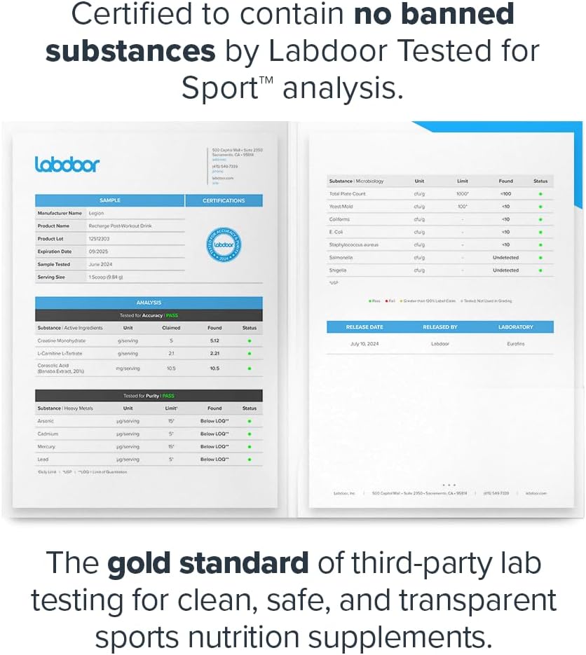 Tested for purity and potency in an ISO 17025 accredited third-party lab, and independently certified to contain no contaminants or banned substances by Labdoor. Every bottle of our Recharge workout supplement for men and women is guaranteed to provide exactly what the label claims and nothing else.