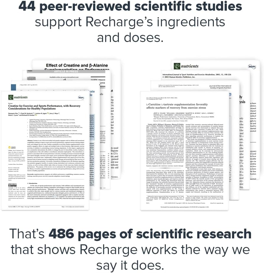 44 peer-reviewed scientific studies support Recharge’s combination of ingredients and doses, including flavored creatine. That’s 486 pages of scientific research that shows Recharge muscle builder for men and women works exactly like we say it does.