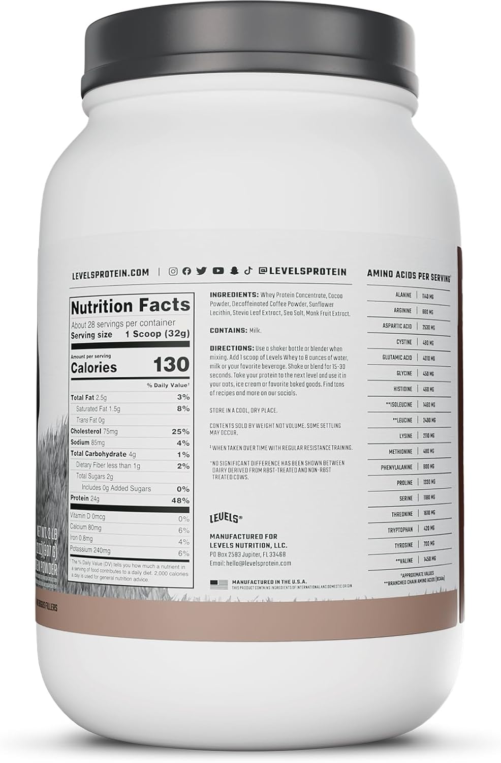 LEVELS WHEY PROTEIN: Each scoop of Levels Chocolate Mocha Whey contains 24g Protein, 5.4g BCAAs (branched-chain amino acids), and no added sugars. Trusted by athletes, fitness enthusiasts and daily grinders everywhere, our whey is crafted for everyone’s lifestyle.