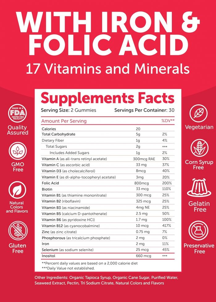 Packed With 17 Essential Ingredients – Formulated with vitamins A, B, C, D, E, zinc, iron, and folic acid, these prenatal gummies for women are Non-GMO, vegetarian, gluten-free, soy-free, and gelatin-free.