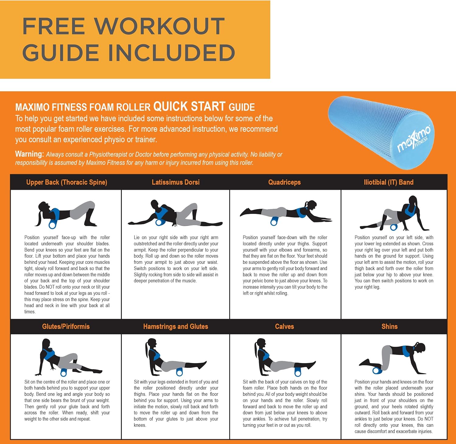 Gli esercizi consigliati sono facilmente eseguibili e il Rullo Maximo Fitness è della giusta consistenza, leggero e sufficientemente rigido da non deformarsi ne crearsi lividi nel usarlo. Una scheda di esercizi è fornita con il rullo, in inglese ma il negozio provvede automaticamente all'invio via email di una scheda di esercizi tradotti in italiano, oltre che che un buon servizio di dopo acquisto.