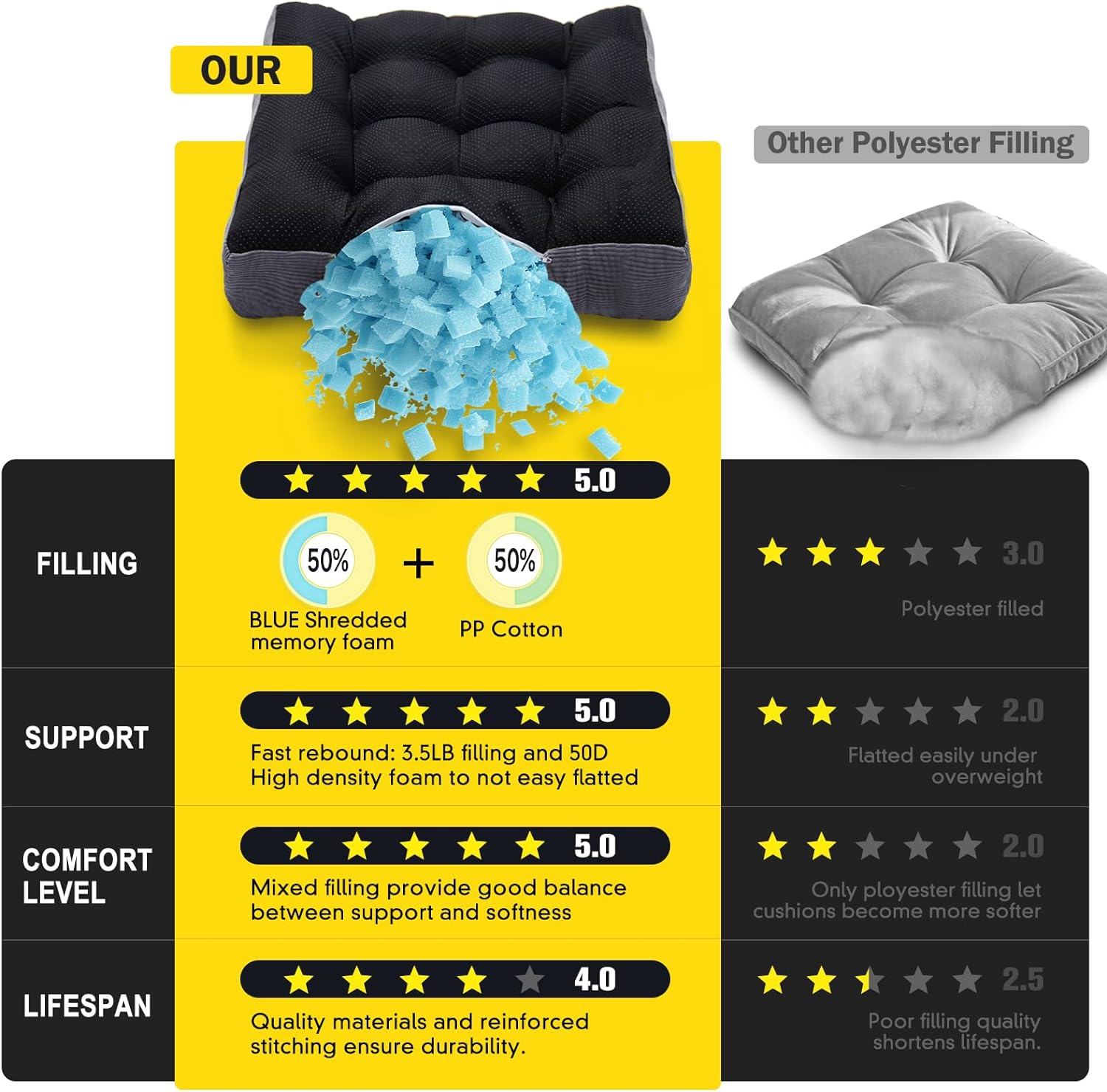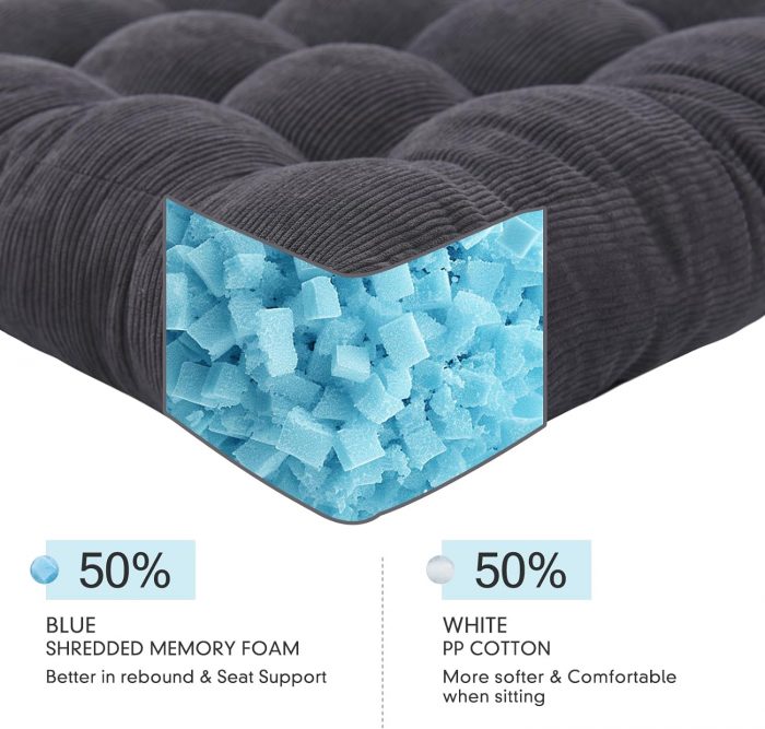 Memory Foam Filling:This floor cushion stands out in rebound speed and durability than most others for its shredded blue memory foam filling. It offers soft seated support and relieves hip & leg pressure when meditation