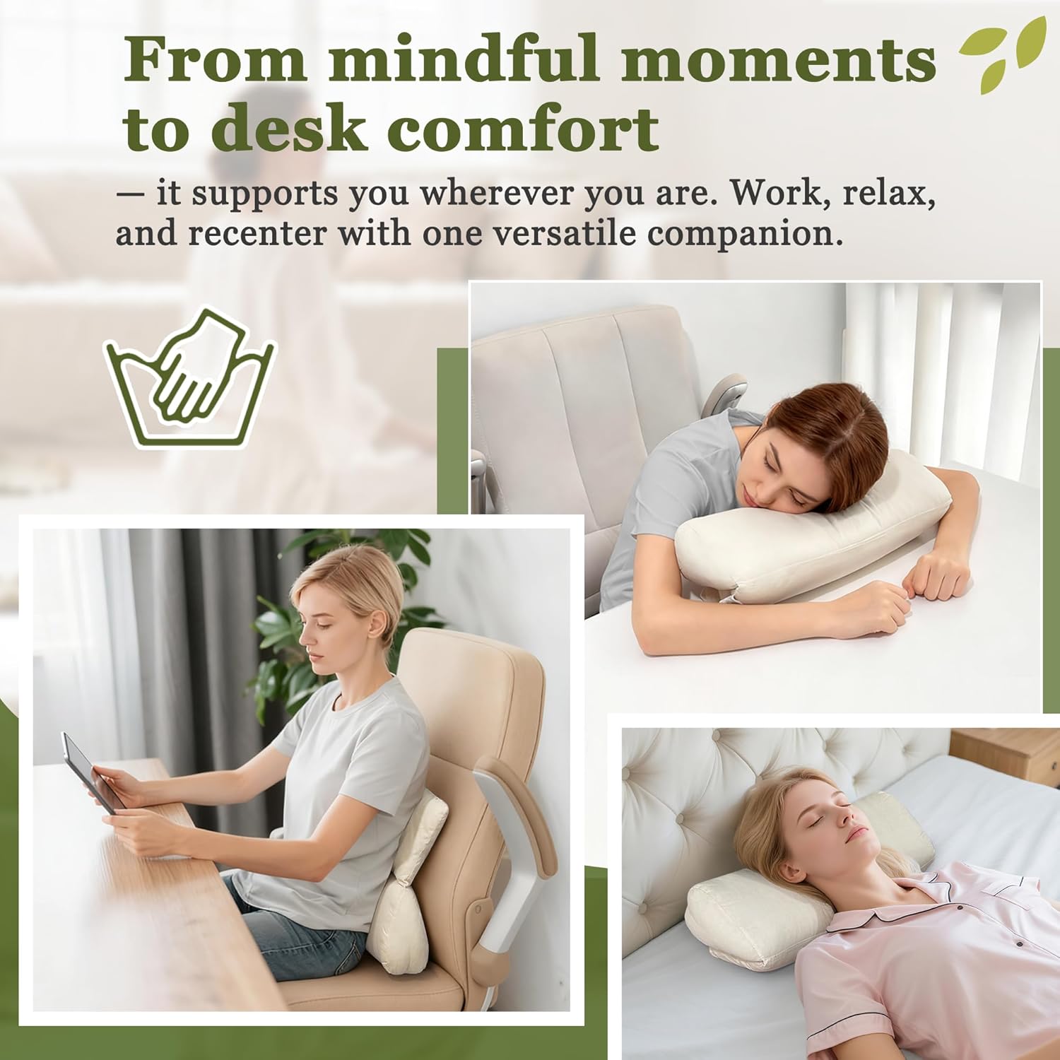 Use it as a lumbar support at your desk, a comfort cushion for napping, or a kneeling pad. It’s your all-in-one companion for work, relaxation, and recentering.