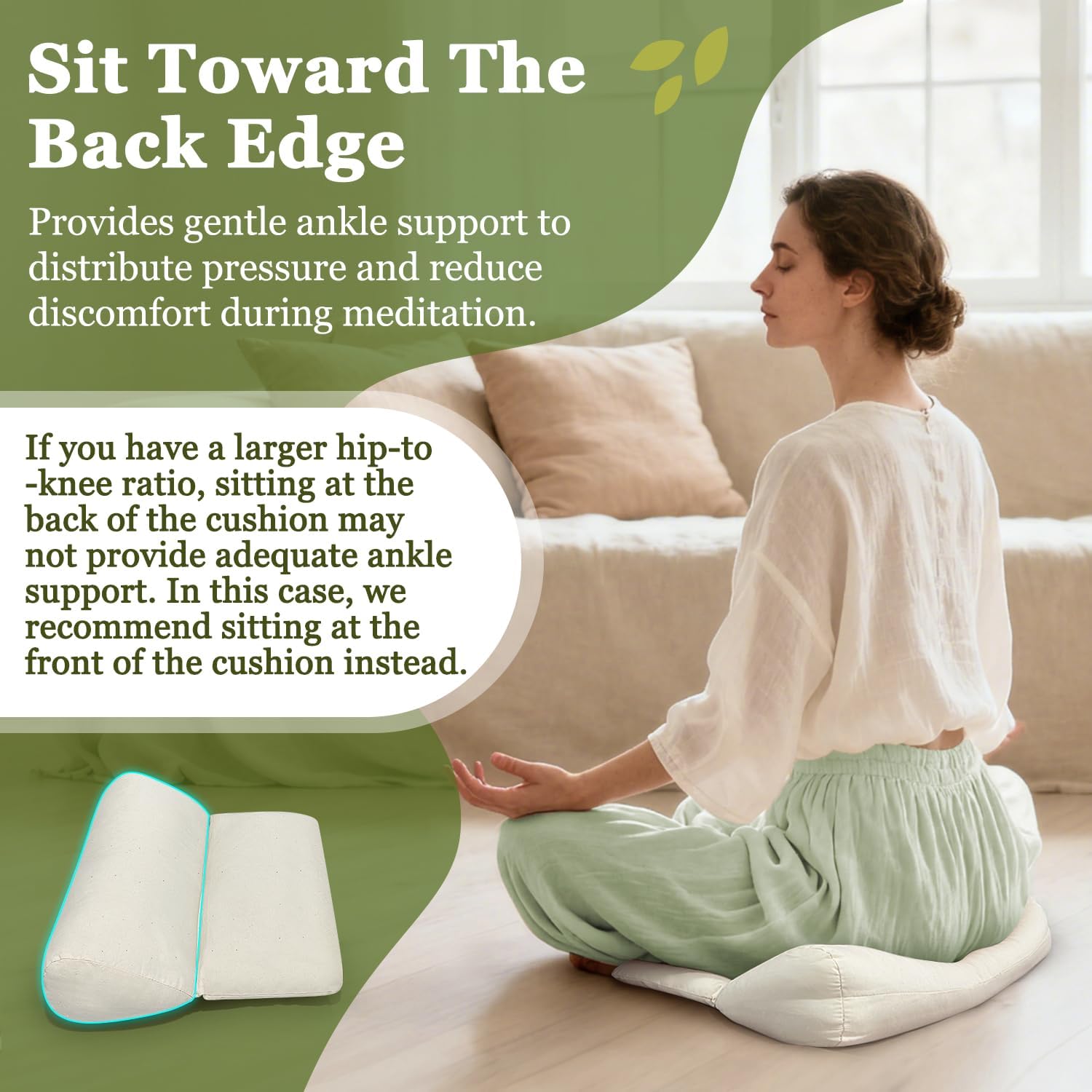【Two Strategic Sitting Positions for Different Needs】Sit on the Front Edge: Ideal for limited hip flexibility; fills the gap beneath the hips to help restore the spine’s natural curve.Sit on the Back Edge: Offers gentle ankle support and pressure relief. (Note: Users with a larger hip-to-knee ratio are advised to use the front edge for optimal support.)