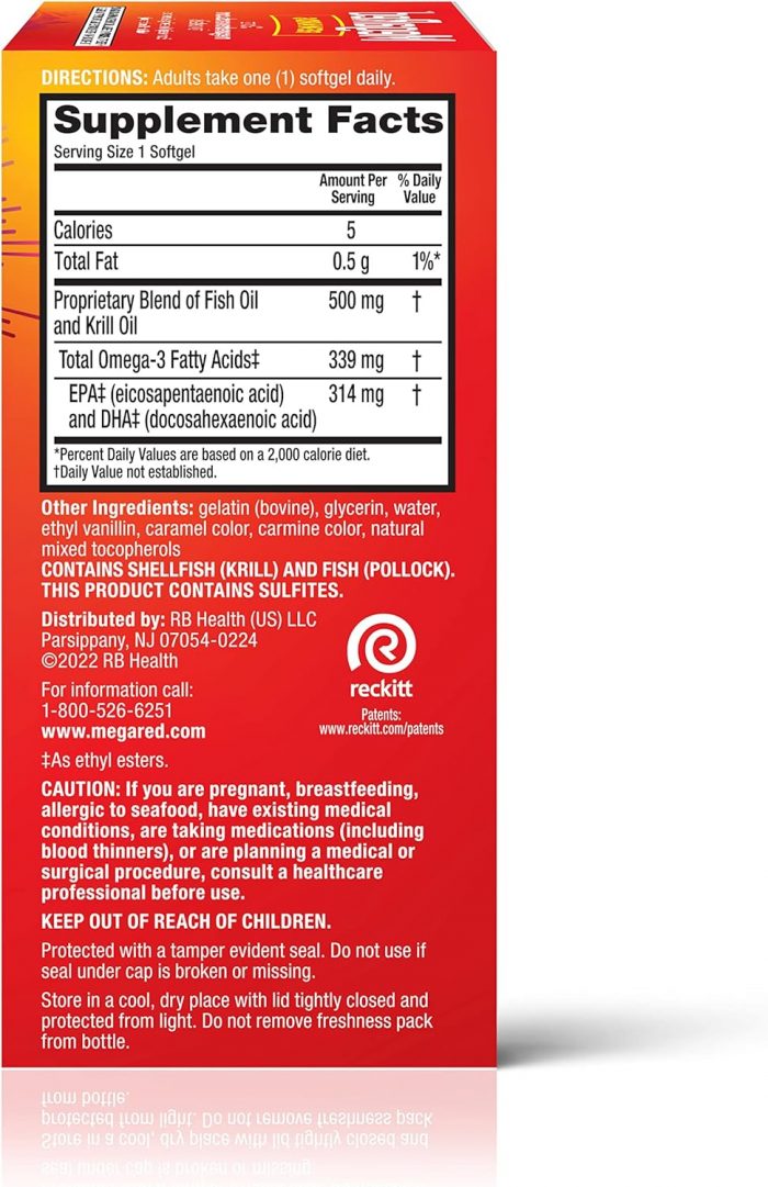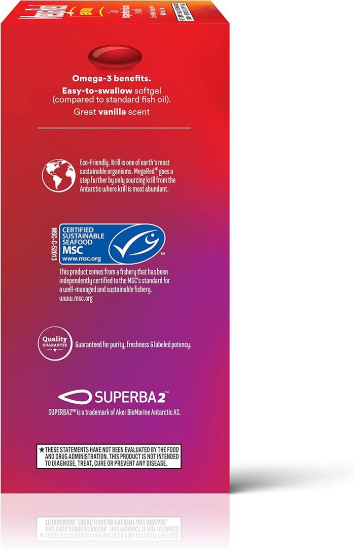 FISH and KRILL OIL TOGETHER: MegaRed Advanced 4-in-1 omega 3 supplement uses a special combination of high concentration fish oil and high absorption krill oil that has 2X more Omega 3s vs standard fish oil alone, and it supports heart, joint, brain, and eye health. OMEGA 3 SUPPLEMENT: Supportive research has shown that consumption of omega 3 fatty acids supplements (EPA and DHA) may reduce the risk of coronary heart disease. HEART HEALTH: MegaRed Advanced 4in1 provides omega 3 fatty acids to support heart health in a once daily softgel. #1 KRILL OIL BRAND: MegaRed is the #1 Doctor Recommended Krill Oil brand for heart health. Don’t just take our word for it check out our 5-star rating and read our customer reviews. ANTARCTIC KRILL OIL: Eco-Friendly, Krill is one of earth’s most sustainable organisms. MegaRed goes a step further by only sourcing krill from the Antarctic where krill is most abundant. EASY ABSORPTION: Krill oil carries its Omega-3 in a phospholipid form which helps absorption the human body. OMEGA 3 FISH OIL: MegaRed Omega3 Fish Oil softgel, a cod liver oil capsules alternative, has 2X more Omega 3s vs standard fish oil alone. OMEGA 3 EPA DHA SUPPLEMENTS: Supportive but not conclusive research has shown that consumption of EPA and DHA Omega-3 fatty acids may reduce the risk of coronary heart disease. HEART HEALTH SUPPLEMENTS: With MegaRed Omega3 supplement, krill and fishoil, live your ultimate life to the fullest. THESE STATEMENTS HAVE NOT BEEN EVALUATED BY THE FOOD AND DRUG ADMINISTRATION. THIS PRODUCT IS NOT INTENDED TO DIAGNOSE, TREAT, CURE OR PREVENT ANY DISEASE.