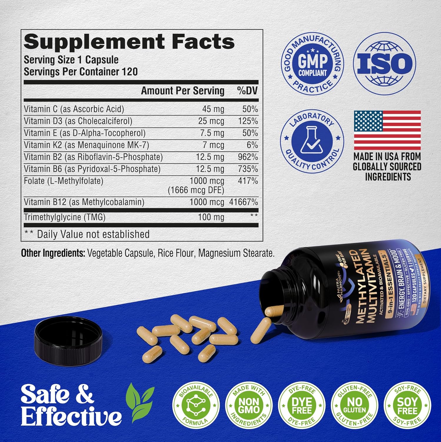 Made in USA With Globally Sourced Ingredients — our methylated multivitamin supplement is proudly manufactured in the USA under strict quality control standards. Non-GMO, DYE-free, No Gluten & Soy-Free, and GMP-certified, methylated multivitamin for men & women are produced with the most potent ingredients for maximum efficacy & purity in every batch.