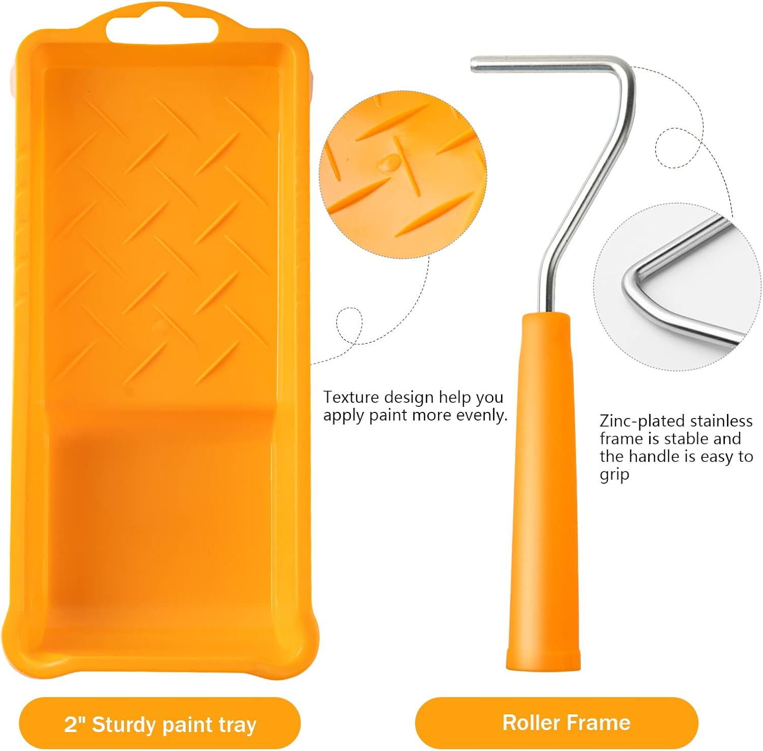 Small Paint Roller Kit: includes 6 pcs 2 inch paint roller, a paint roller frame 2 inch, a 2 inch paint tray with a liner. Suitable for painting small and hard to reach spaces
