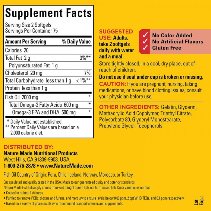 Nature Made Burp Less (3) Fish Oil 1000 mg is a dietary supplement that provides 300 mg Omega-3 fatty acids per softgel to help support a healthy heart. A serving of two Nature Made Fish Oil Omega 3 softgels provides 2000 mg Fish Oil with 600 mg Omega-3s (500 mg EPA and DHA). Sourced from high quality ingredients, these gluten free and dairy free Fish Oil 1000mg Omega-3 softgels have no color added and no artificial flavors. These Omega 3 Fish Oil softgels are purified to remove mercury (2) from wild-caught ocean fish, not farm-raised fish. Adults, take two of these Omega 3 Fish Oil supplements daily with water and a meal. For those who don’t consume fish regularly, an Omega 3 supplement like fish oil Nature Made can help provide Omega 3 Fish Oil for men and women. Nature Made Omega 3 supplements are quality you can trust. (2)Purified to remove PCBs, dioxins and furans, and mercury to ensure levels below 0.09 ppm, 2 ppt WHO TEQs, and 0.1 ppm respectively. (3)Coated to reduce fish burps. *Based on a 2022 survey of pharmacists who recommend branded vitamins and supplements.