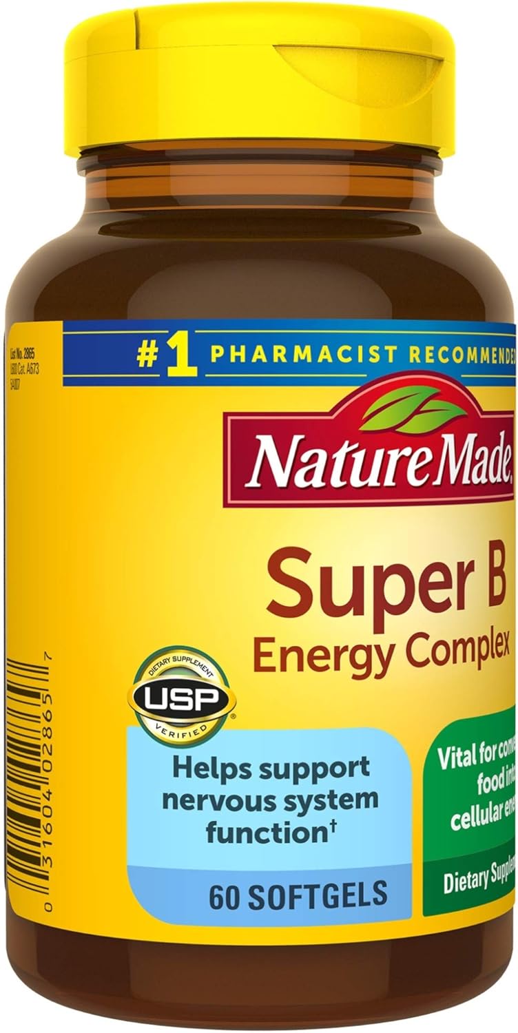 Nature Made Super B (1)Energy Complex Softgels offer certain B vitamins that help support brain cell function. These Nature Made Vitamin B Complex softgels are gluten free and contain no artificial flavors, no synthetic dyes, and no preservatives. This Nature Made Super B Energy Complex supplement also offers energy metabolism support(1). This Nature Made Super B Complex is a dietary supplement that can help you with your recommended allowance of B vitamin nutrients that are missing from your normal diet. This Nature Made Super B Energy Complex provides all 8 essential B vitamins: thiamin (B1), riboflavin (B2), niacin (B3), pantothenic acid (B5), B6 (pyridoxine), biotin (B7), folic acid (B9), and B12 (cyanocobalamin). Adults take one of these Super B vitamin cellular energy supplements daily with water and a meal. Nature Made supplements are quality you can trust. USP has tested and verified ingredients, potency and manufacturing process. USP sets official standards for dietary supplements. Visit the USP verified website for more information. (1)Helps convert food into cellular energy. *Based on a survey of pharmacists who recommend branded vitamins and supplements