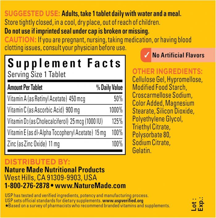 Nature Made Super C with Vitamin D3 & Zinc is a dietary supplement that supports immune health and offers antioxidant support. Sourced from high-quality ingredients, this Nature Made Super C Vitamin C with Zinc and D3 supplement has no artificial flavors. This Nature Made Vitamin C supplement is an excellent source of five key immune system support nutrients. Each Super C vitamin with Zinc and D3 tablet contains 900 mg of Vitamin C, 450 mcg of Vitamin A, 25 mcg of Vitamin D, 15 mg of Vitamin E, and 11 mg of Zinc to lend your immune system a helping hand. This Vitamin C and Zinc supplement is perfect for anyone looking to supplement their diet, especially if it is low in fruits and vegetables. Adults, take one Nature Made Super C with Zinc tablet daily with water and a meal. Nature Made supplements are quality you can trust. USP has tested and verified ingredients, potency, and manufacturing process. USP sets official standards for dietary supplements. Visit the USP verified website for more information. *Based on a survey of pharmacists who recommend branded vitamins and supplements.