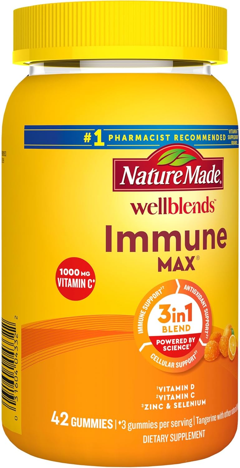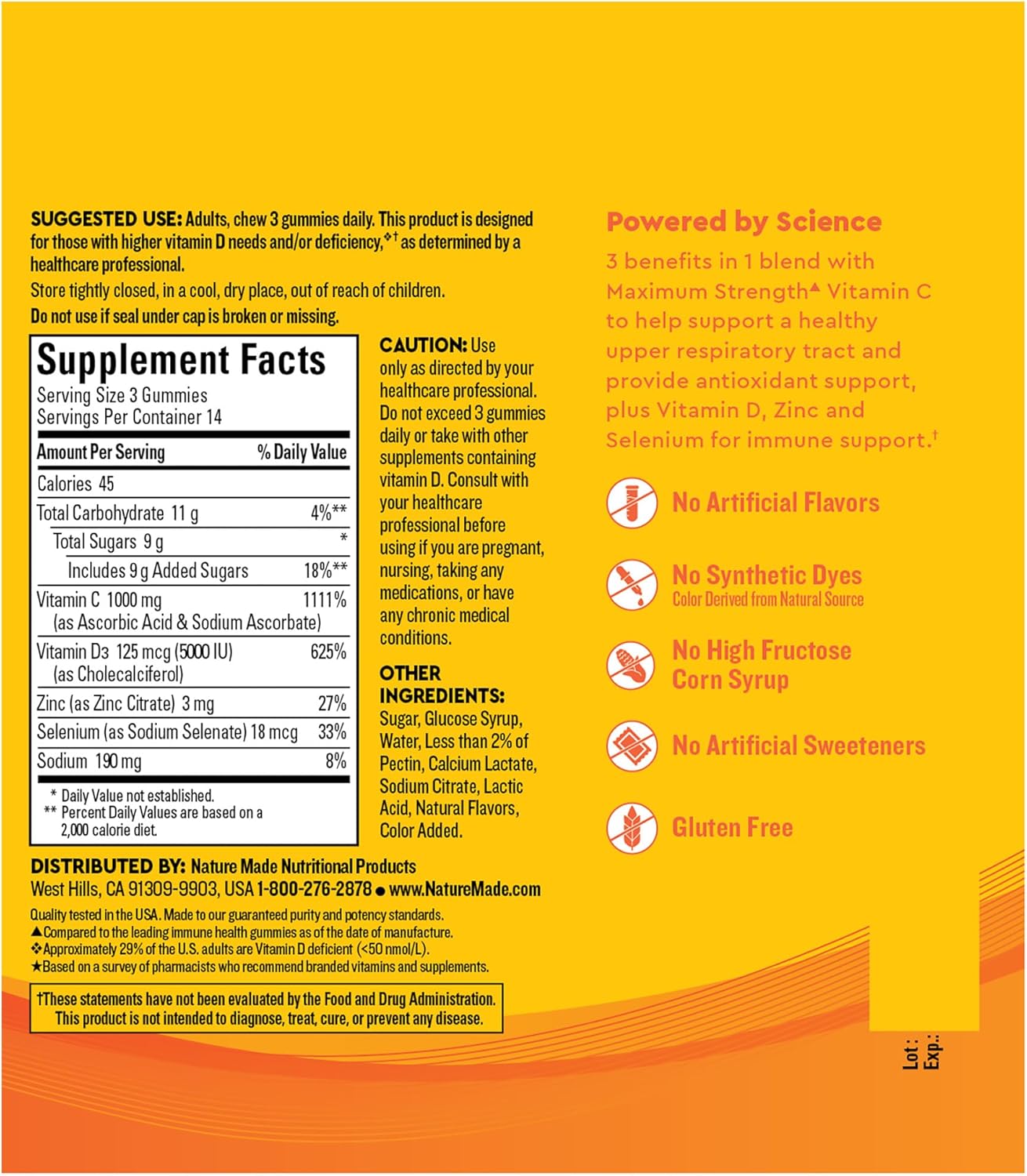 Looking for a delicious way to support your immune health? Nature Made Wellblends ImmuneMAX Gummies are a 3-in-1 blend with ingredients powered by science to support your immune health. These immune support gummy vitamins offer 1000 mg Vitamin C (per 3 gummies), Vitamin D3 5000 IU (125 mcg) and an excellent source of Zinc and Selenium. Vitamin C is an antioxidant that supports the immune system and helps support a healthy upper respiratory tract. Vitamin D helps support a healthy immune response. Zinc and Selenium provide antioxidant support to protect immune cells from free radicals. All that immune support in just 3 daily Tangerine flavored gummies. Nature Made Wellblends ImmuneMAX Gummies are designed for those with higher Vitamin D needs and/or a deficiency(3) as determined by a healthcare professional. (1) Ingredients powered by science (2) Higher dose as compared to the leading immune support gummy as of the date of manufacture (3) Approximately 29% of U.S. adults are Vitamin D deficient (<50 nmol/L) (4) Vitamin C helps support a healthy upper respiratory tract. These statements have not been evaluated by the Food and Drug Administration. This product is not intended to diagnose, treat, cure, or prevent any disease.