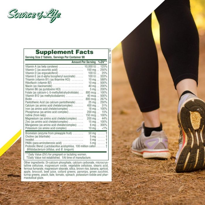 Vitamin A (as beta carotene), Vitamin C (as ascorbic acid), Vitamin D [as cholecalciferol (D3)], Vitamin E (as d-alpha tocopheryl succinate), Thiamin (vitamin B1) (as thiamine HCI), Riboflavin (vitamin B2), Niacin (as niacinamide), Vitamin B6 (as pyridoxine HCI), Folate (as calcium-L-5-methyltetrahydrofolate) (L-methylfolate), Vitamin B12 (as methylcobalamin), Biotin, Pantothenic Acid (as calcium pantothenate), Calcium (as amino acid chelate/complex), Iron (as amino acid chelate/complex), Phosphorus (as amino acid complex), Iodine (as potassium iodide), Magnesium (as amino acid chelate/complex), Zinc (as amino acid chelate/complex), Manganese (as amino acid chelate/complex), Bromelain (enzyme from pineapple fruit), Inositol, PABA (para-aminobenzoic acid), Probiotic Blend (Lactobacillus acidophilus, Bifidobacterium longum, Bifidobacterium bifidus). Other ingredients: di-calcium phosphate, calcium carbonate, magnesium oxide, microcrystalline cellulose, vegetable cellulose, stearic acid, ferrous fumarate, magnesium stearate, choline bitartrate, silica, rice bran, banana, apricot, apple, broccoli, beet juice, collard greens, parsnips, green zucchini, turnip, peach, kale, tomato, spinach and pharmaceutical glaze.