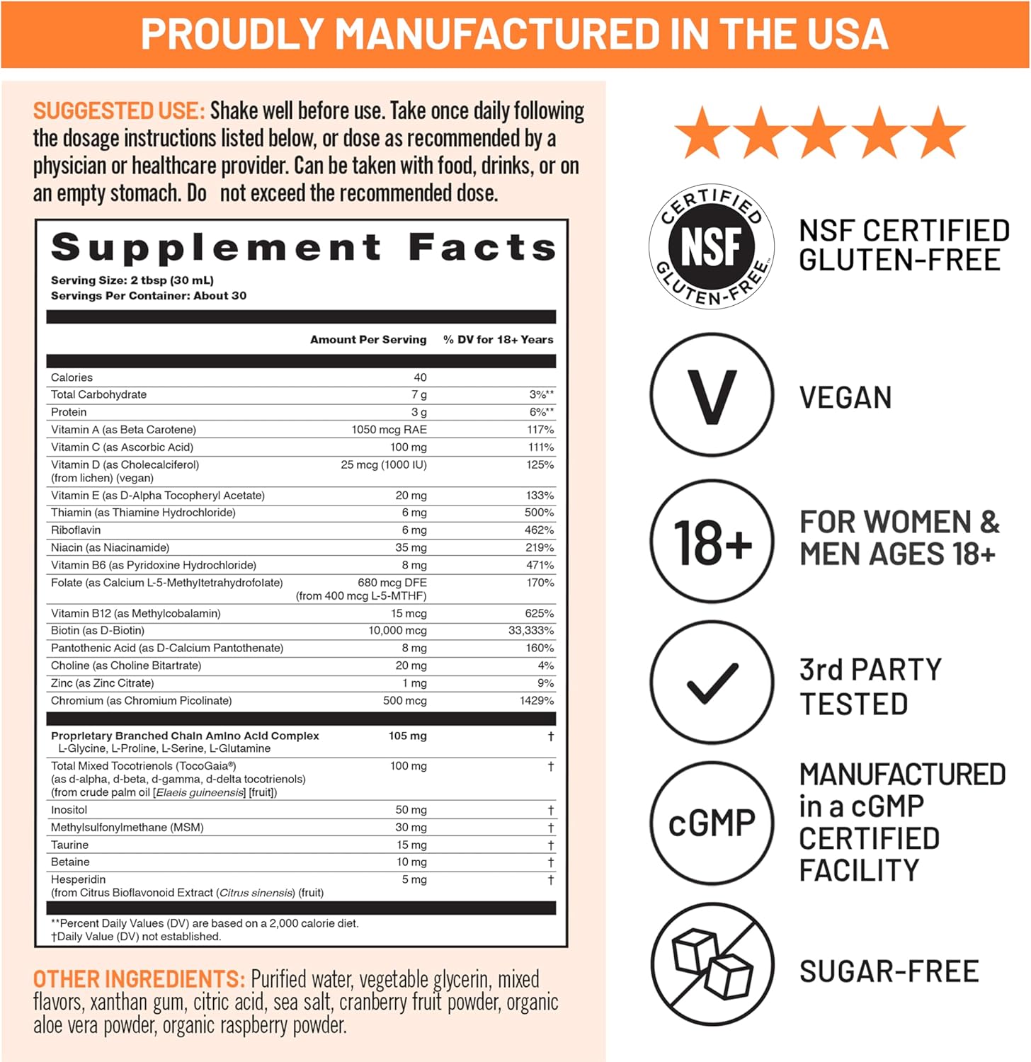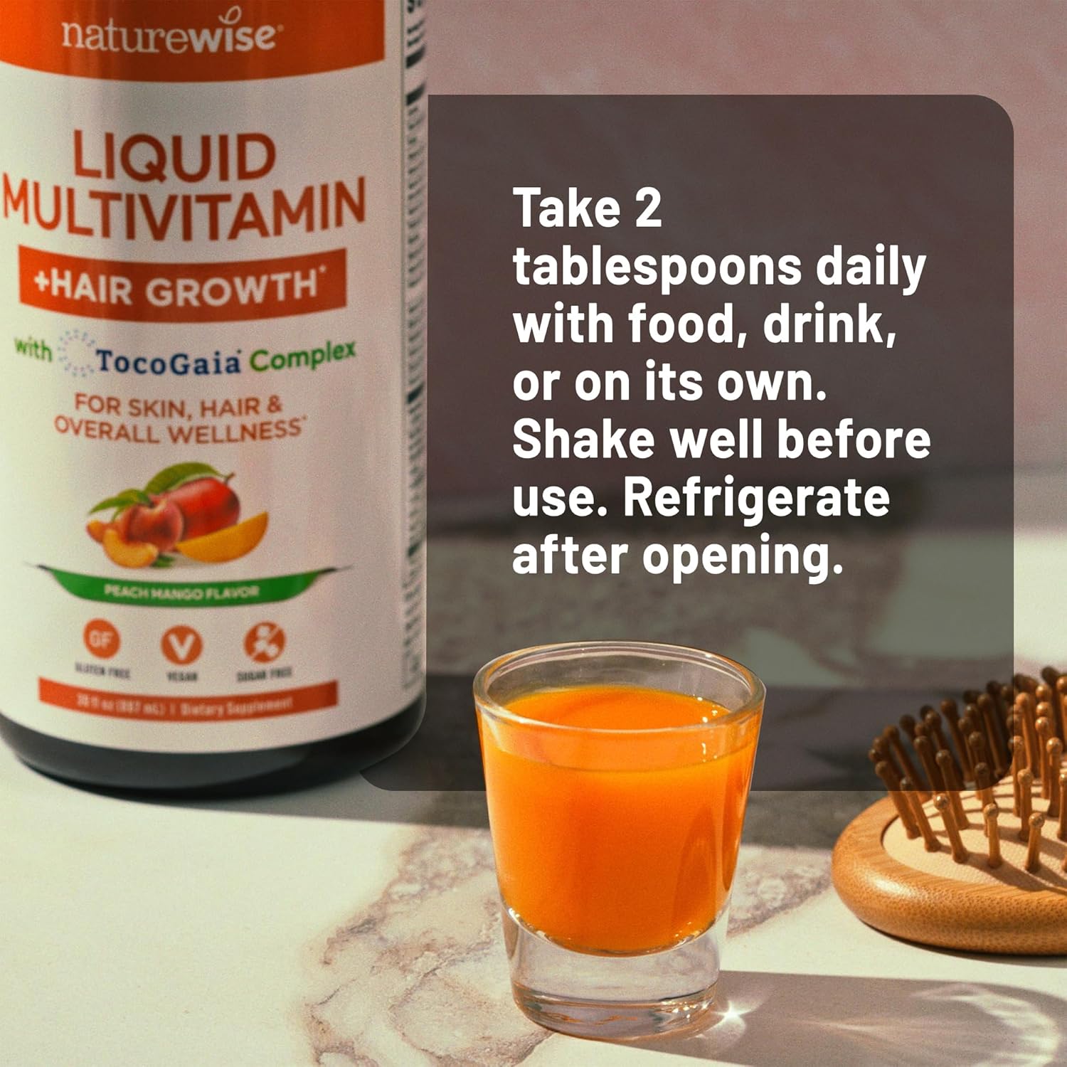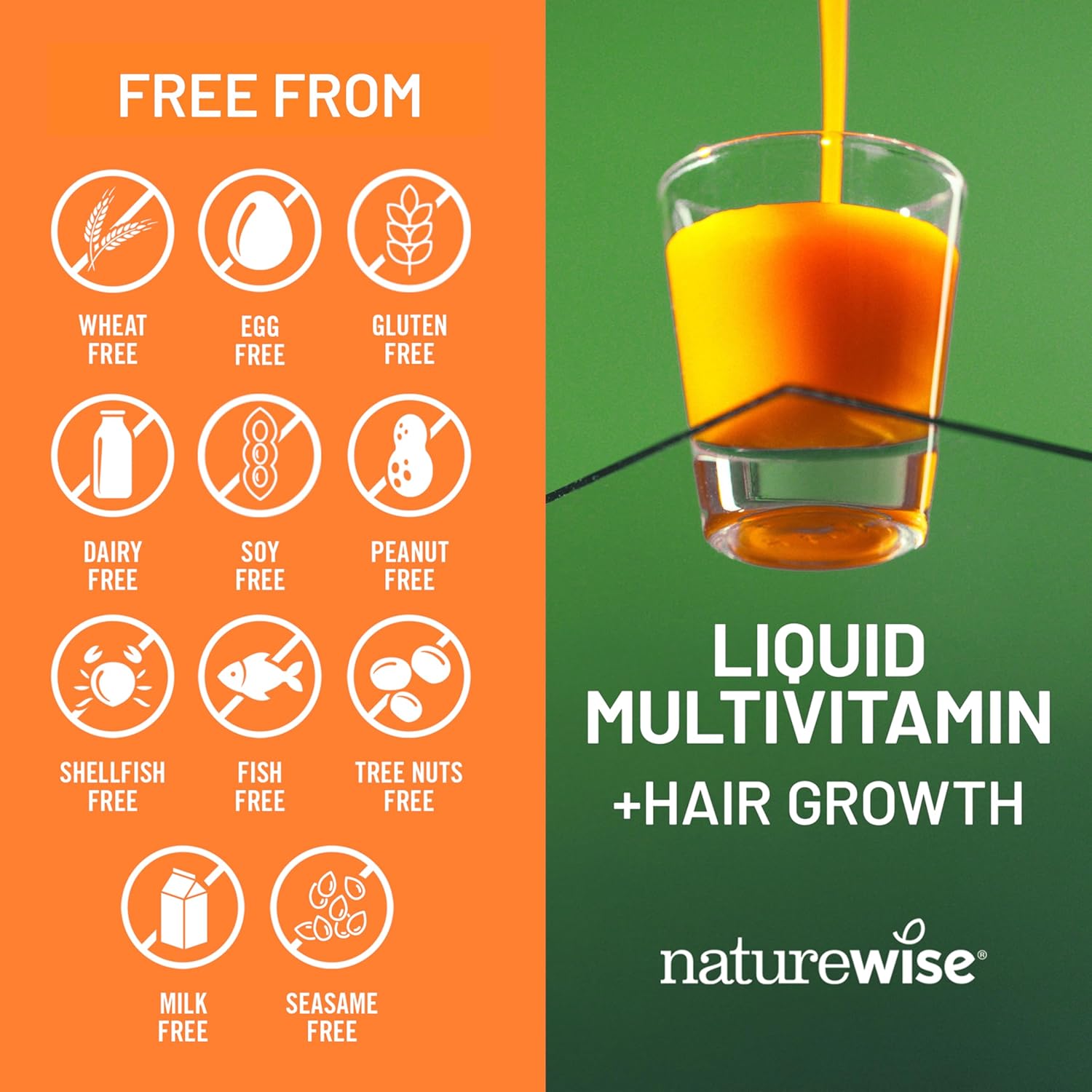 NatureWise Liquid Multivitamin + Hair Growth is a premium formula designed for women and men ages 18+. This delicious, easy-to-take multivitamin supports hair health, immune function, and mental clarity, making it a perfect addition to your wellness regimen.* Formulated to nourish your hair from within, this liquid multivitamin features TocoGaia®, a blend of tocopherols that supports healthy hair growth and strength. We also added an amino acid complex with L-glycine, L-proline, L-serine, and L-glutamine. L-glycine helps promote fuller locks and healthy hair volume. L-proline Helps support collagen and keratin synthesis. L-serine helps maintain the health of hair follicles and ensures the structural integrity of newly produced hair cells. L-glutamine contributes to the synthesis of keratin, which is the structural protein that hair is made of. This can help make hair strands strong and resilient. With 10,000 mcg of biotin, a key B vitamin, this multi supports vibrant hair and nails, helping you look and feel your best.* Energy and focus are within reach with our advanced blend of B vitamins. Featuring methylated B12 and folate (B9), these essential nutrients are in their most bioavailable form, ensuring optimal absorption to support energy metabolism and a healthy nervous system.* Forget struggling with bulky pills and capsules. Simply take 2 tablespoons daily for a convenient and enjoyable way to meet your nutritional needs. Shake well before use and refrigerate after opening for maximum freshness. Crafted with care, NatureWise Liquid Multivitamin + Hair Growth is third-party tested for purity and potency. It is vegan, sugar-free, gluten-free, and free from common allergens, including dairy, eggs, soy, nuts, shellfish, and sesame. Made in the USA in a cGMP-certified facility, this multivitamin reflects our commitment to quality and your health. *These statements have not been evaluated by the Food and Drug Administration. This product is not intended to diagnose, treat, cure, or prevent any disease.
