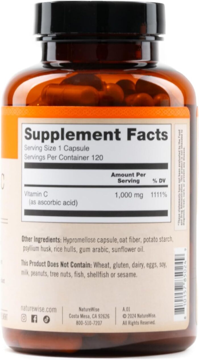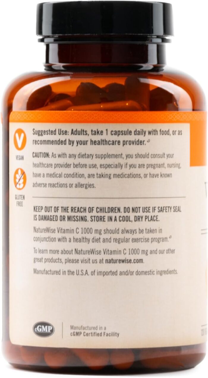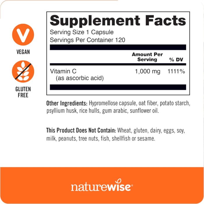 VEGAN & NON-GMO: NatureWise Vitamin C 1000 mg Capsules are vegan, non-GMO, and gluten free. These premium capsules do not contain wheat, gluten, dairy, eggs, soy, milk, tree nuts, peanuts, fish, shellfish, or sesame.