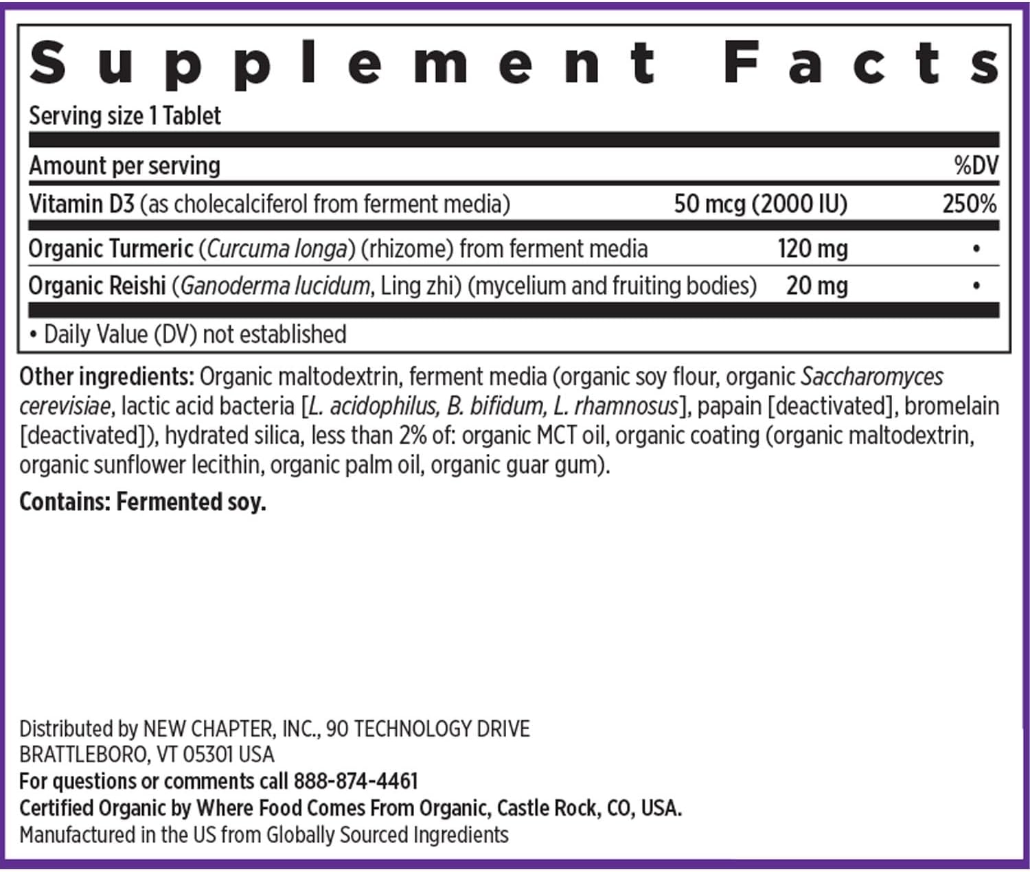 Did you know up to 70% of Americans have inadequate levels+ of Vitamin D? New Chapter®’s fermented Vitamin D3 supplements promote strong, healthy bones and teeth, and also dial up immune support and heart health support.* Our quality tested, USDA Organic and non-GMO vitamin D3 supplement is formulated to unlock nutrients for your body to absorb, providing a full 250% Daily Value. Each one-daily, easy-to-swallow tablet includes researched superfood whole Turmeric and adaptogenic Reishi mushroom. *These statements have not been evaluated by the Food and Drug Administration. This product is not intended to diagnose, treat, cure, or prevent any disease. + Based on the Endocrine Society’s definition of vitamin D sufficiency as serum 25-hydroxyvitamin D values of >30 ng/ML.