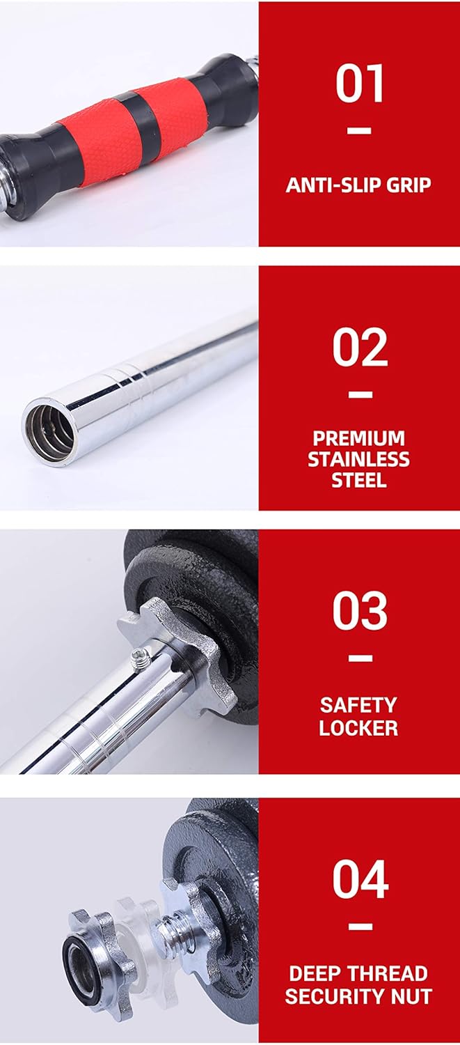 2-IN-1 METAL DUMBBELL-BARBELL WEIGHT SET-This adjustable dumbbell is made with metal and coated with anti-rust metal color which looks shine and cool. The set comes with a connecting bar that can be easily attached to both dumbbells to transform into a barbell. There are also adjustable weight plates that let you customize the weight of the dumbbell/barbell to your desired setting. This allows you to efficiently use our dumbbell/barbell set for many exercises instead of buying multiple sets.