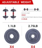 MULTI-WEIGHT SETTING: This set comes with 8 weight plates: four 1.1 lb. plates and four 2.75 lb. plates. Each dumbbell handle weighs 2.3 lbs. The lowest weight you can adjust to for each dumbbell is 2.3 lbs. with no plates attached. The highest weight with all the plates attached is 11 lbs. Weights can be added or taken off in 1.1 lb. or 2.75 lb. increments. The barbell rod weighs 2 lbs., so the barbell can be adjusted from 2 lbs. to 22 lbs.