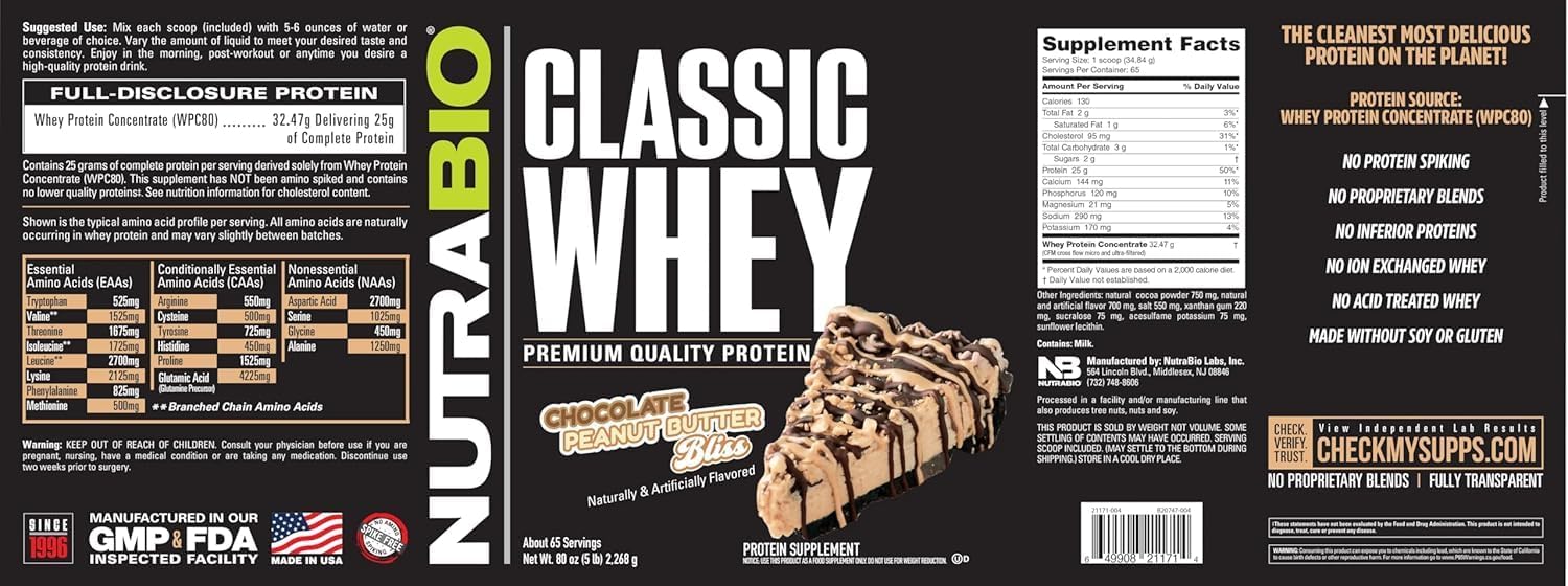 Full Label Disclosure and Transparency: NutraBio Classic Whey offers full label disclosure and no proprietary blends, ensuring you know precisely what you’re getting. This supplement powder delivers 25 grams of pure protein sourced solely from WPC80 whey concentrate. Every batch of every product is tested by independent third-party labs for quality assurance