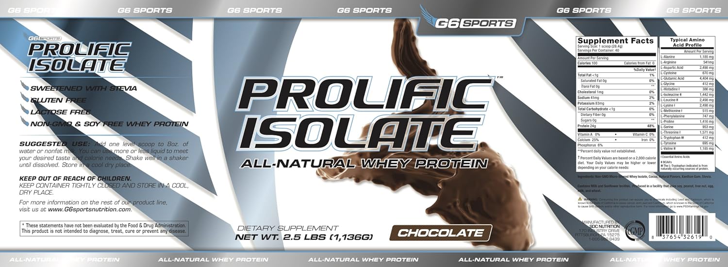 G6 Sports Nutrition Prolific Isolate Whey Protein Powder is an all-natural, high-quality, and non-GMO, protein powder, with only five ingredients on the label.