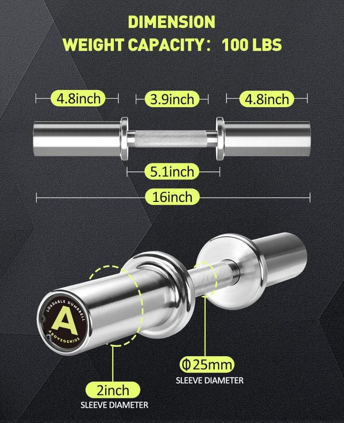 A Great Starter Set: This set includes 2 olympic dumbbell bars and 2 spring collars. The bar is 16″ in length with a 25mm handgrip diameter. Each bar weighs 8.3 LB unloaded, but reaches the weight of 8.3 LB when combined with 2 pair of spring collars