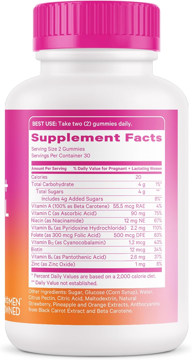 OBGYN-Recommended Prenatal Nutrients These gummies contain critical vitamins for pregnancy including 500 mcg DFE of Folate, 90 mg of Vitamin C, 2.2 mg Vitamin B6, Biotin, and Zinc. Support your baby’s brain, spinal cord, and immune system with a blend crafted for pregnant moms. Plus, our fruity gummies are gentle on the stomach—no nausea here. Perfect for women in all stages of pregnancy, from the first trimester to the last push.