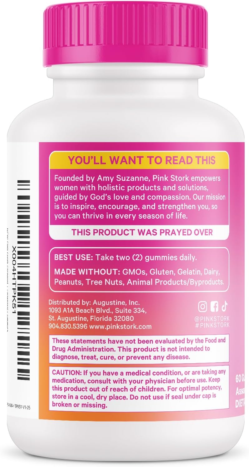 Women-Owned, Mom-Founded, Clean Ingredients Pink Stork is proudly women-owned and women-run, with a mission to support every stage of motherhood. Our founder Amy Suzanne, mom of 6, created products she wished she had on her journey. These gummies are made with clean ingredients, third-party tested, and cGMP certified. Free from gluten, dairy, GMOs, and artificial colors or flavors. Trusted by thousands of moms—supporting fertility, pregnancy, and postpartum health with love.