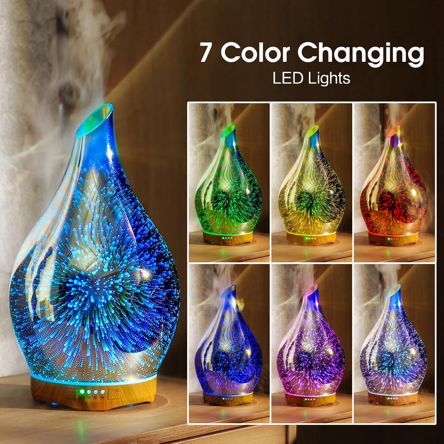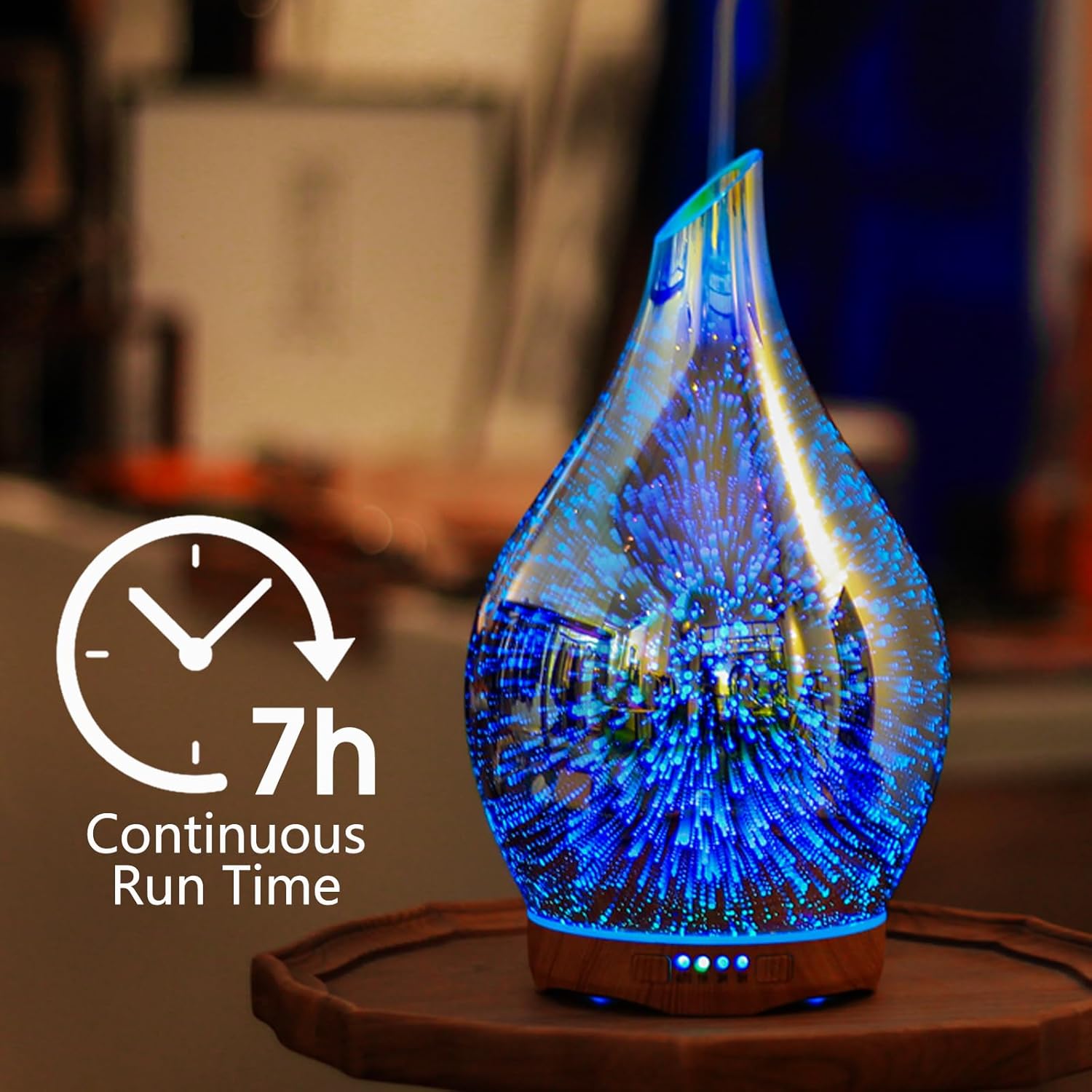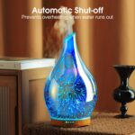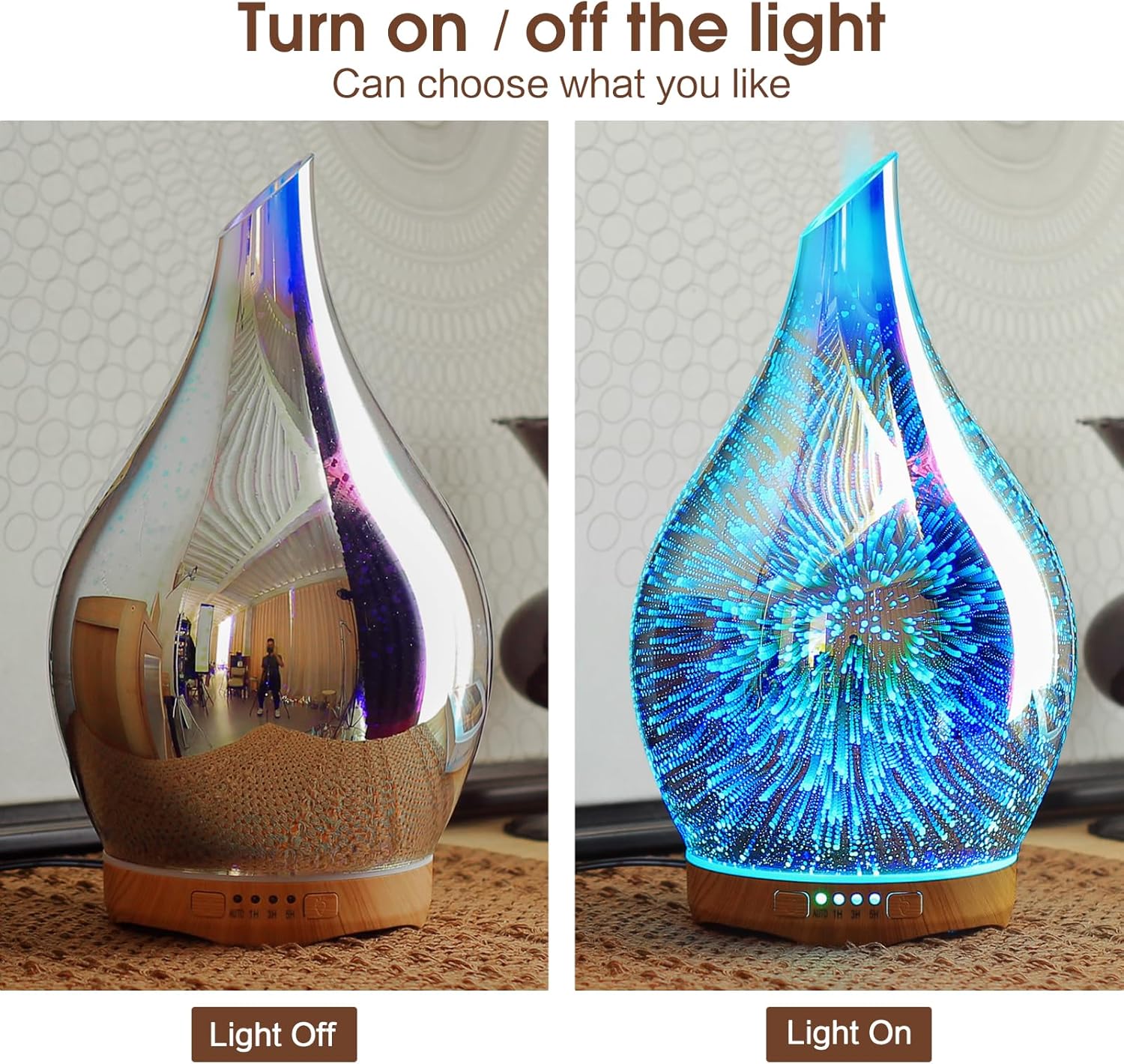 HAND-BLOWN 3D ART GLASS – The 280ml 3D glass essential oil diffuser’s cover is hand-blown and each comes with a unique starburst effect. This firework glass aroma humidifier makes beautiful decorations and match any room.The glass globe on the oil diffuser is shiny silver when turn off the light button and it will show stunning color when turn on the light. Running color changing automatically or fixing on color are both available.