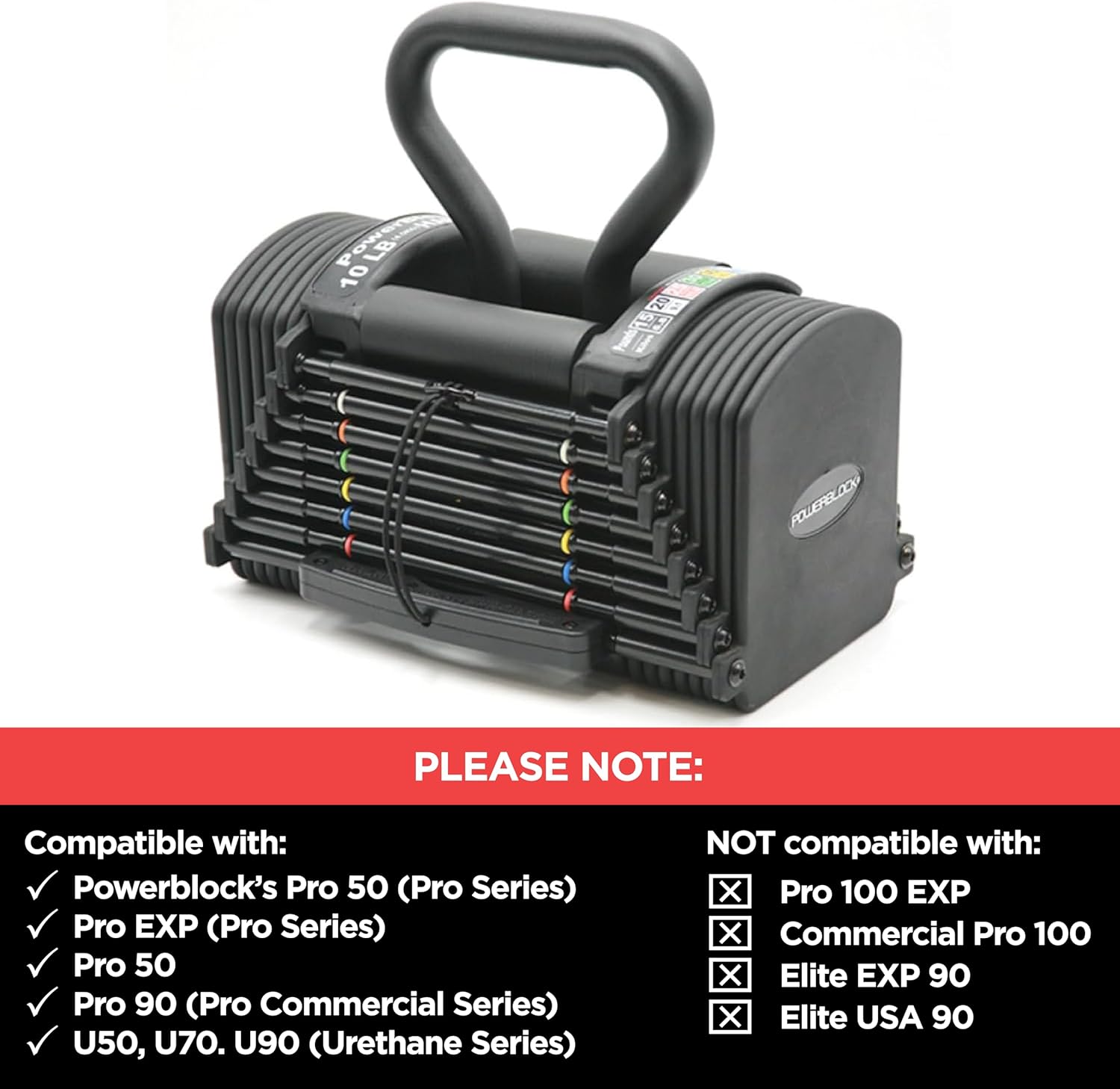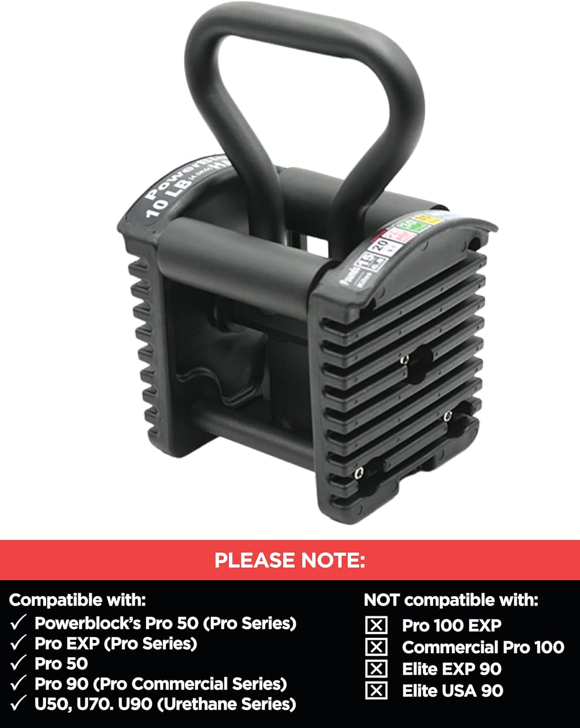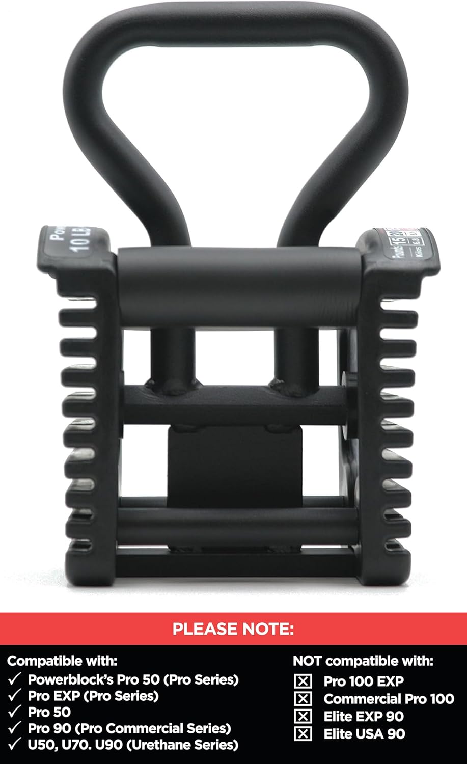 COMPATIBLE WITH OTHER POWERBLOCK PRODUCTS: This adjustable kettlebell handle is compatible with PowerBlock’s Pro 50 (Pro Series), Pro EXP (Pro Series), Pro 50 and Pro 90 (Pro Commercial Series), and U50, U70, U90 (Urethane Series).