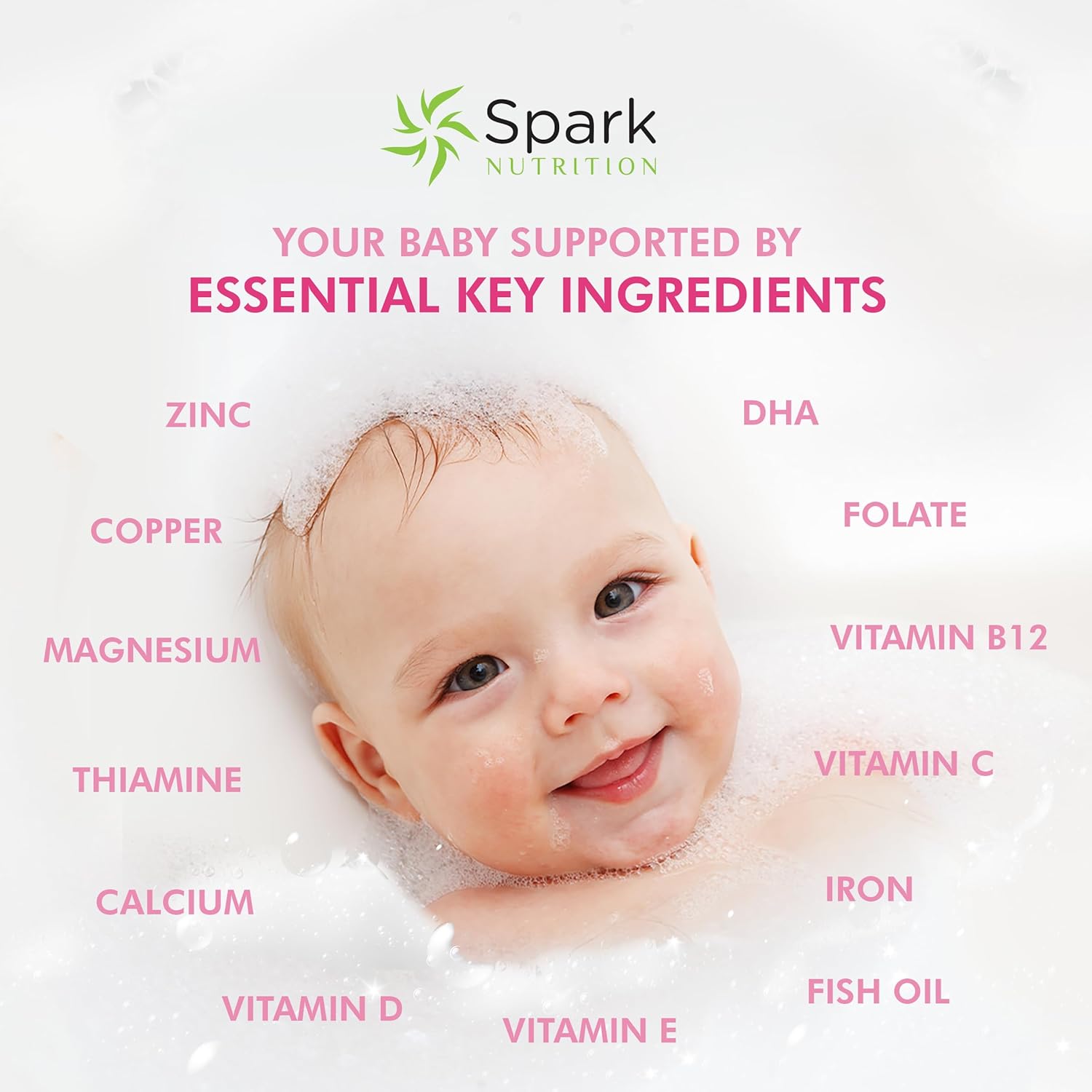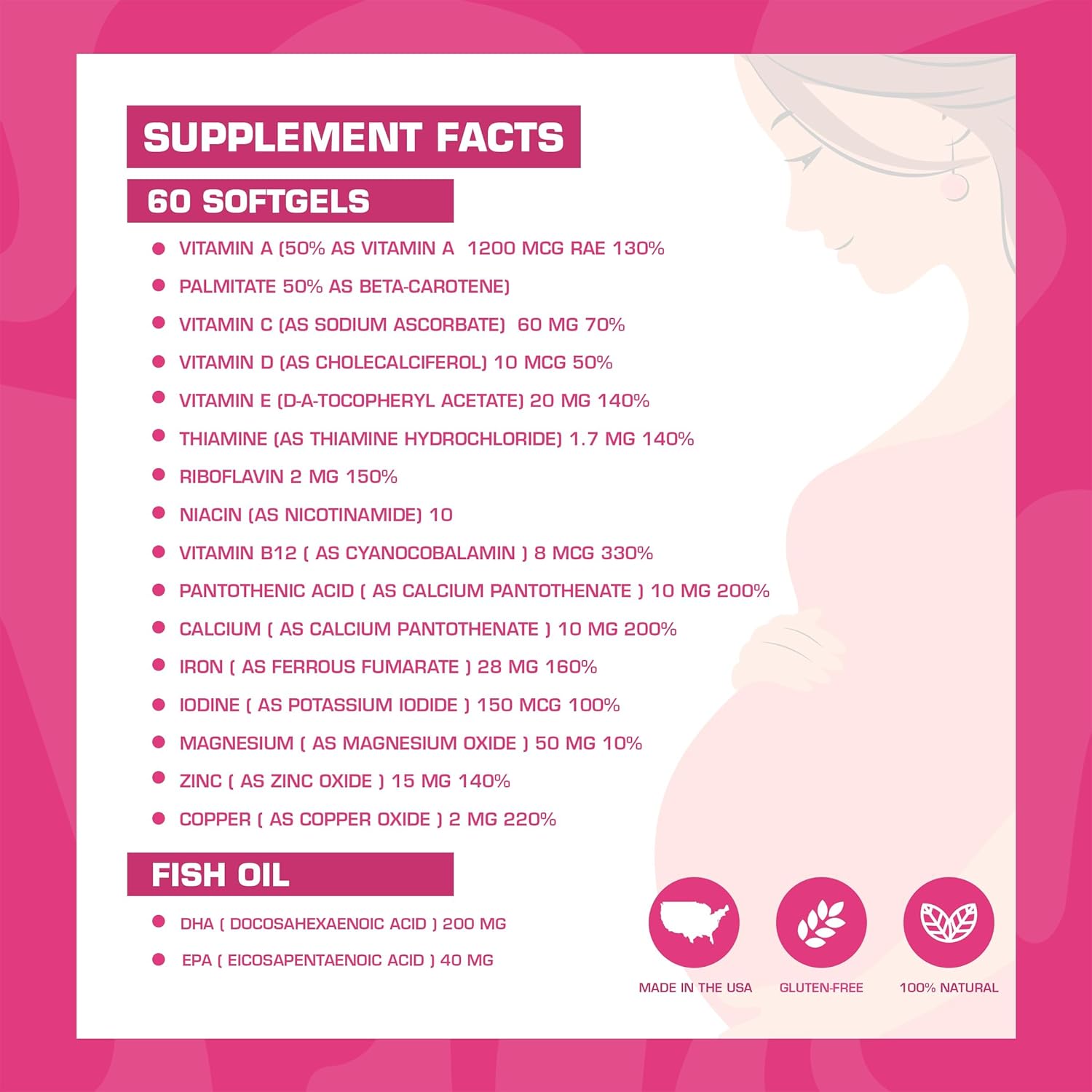 Essential Ingredients for baby & mom support: Folic acid, Omega 3 DHA/EPA, Vitamin A, B6, Vitamin B12, C, D3, E & Minerals: Calcium, Iron, Magnesium, Zinc supplement for women