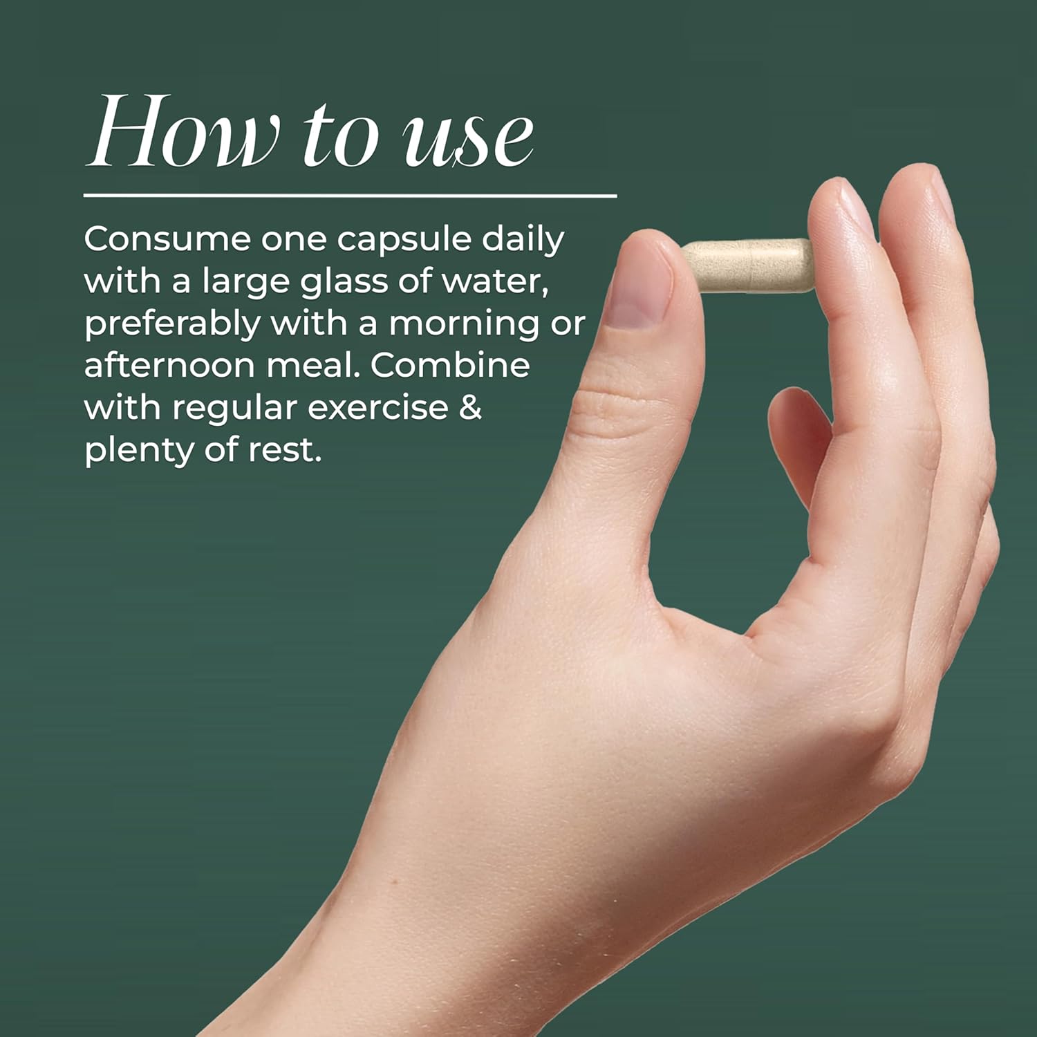 Recommended Dosage: Take one capsule a day with a light snack or meal, and plenty of water, for additional support combine with consistent exercise and rest.