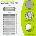 The ProsourceFit Acupressure Mat and Neck Pillow Set is an effective and affordable home remedy for muscle discomfort, stress, insomnia and more. The foam bed and thickness of the neck pillow have plastic needles covering thousands of acupressure points. Choose the regular acupressure mat with 8,910 acupressure points or the longer acupressure mat with 11,178 acupressure points. Acupressure therapy activates pressure points along your body’s meridian lines, stimulating and promoting healing. Ideal for muscle recovery during post-workout or during savasana at the end of a yoga session. Acupressure helps release tension in tight areas like the back, neck and feet.. The material is made of 100% cotton and plant-based eco foam which can be hand washed. The regular mat measures 26 1/2 by 16 1/2 inches and the longer version measures 51 by 19 inches. Both pillows are 14 3/4 by 5 3/4 inches. Both mats provide full back coverage while the longer mat provides coverage from the back to the legs which can be more suitable for someone taller and better for a full-body massage session.