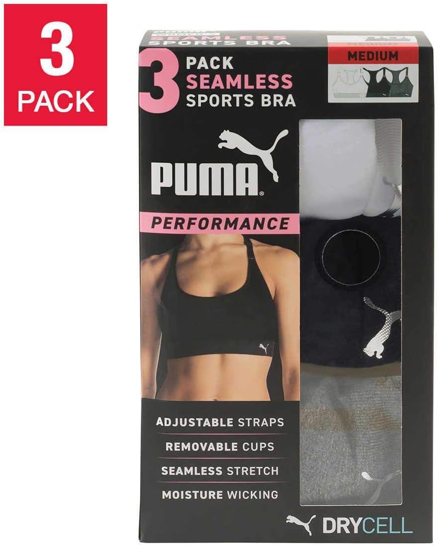 PUMA Women Sports Bra, 3-Pack (Black/White/Grey, S…