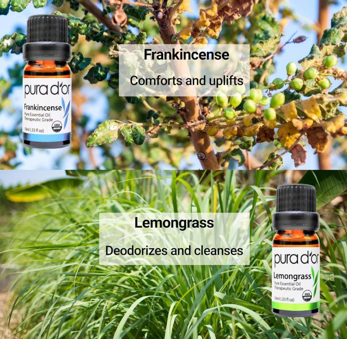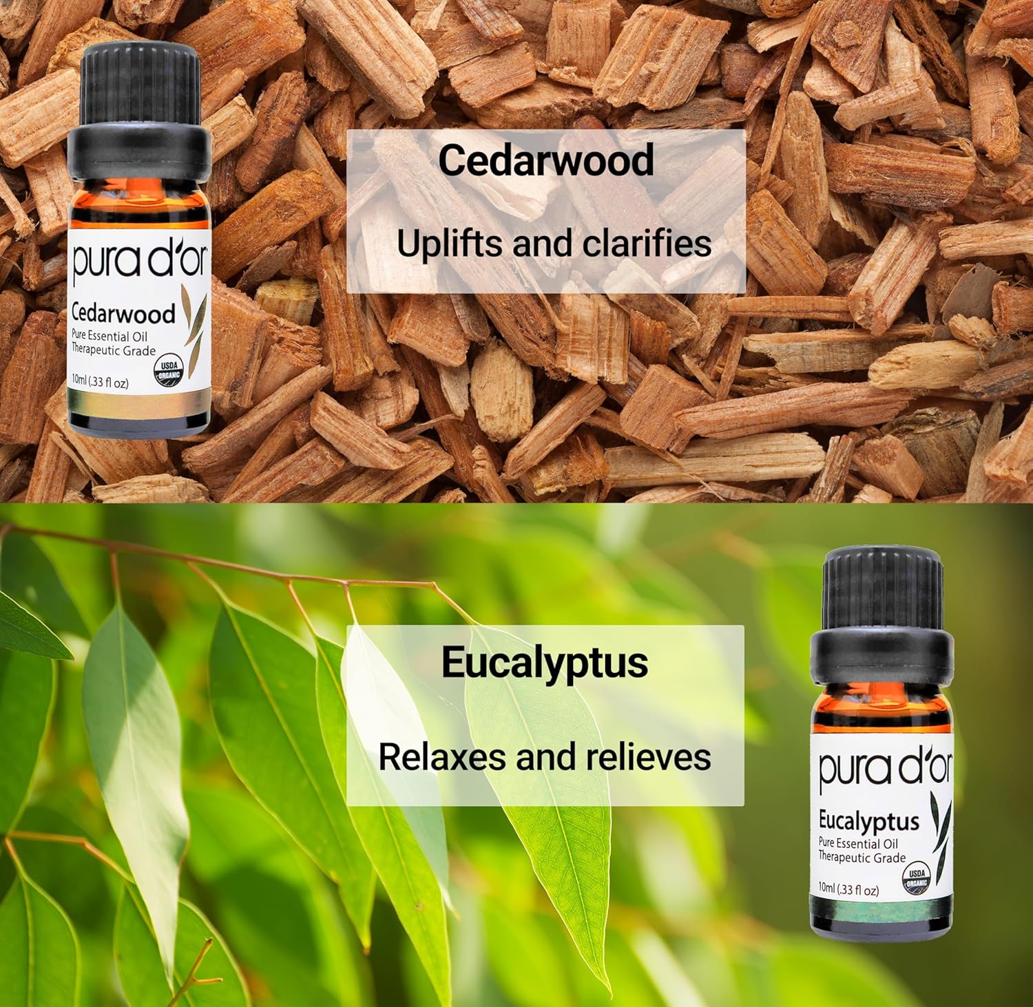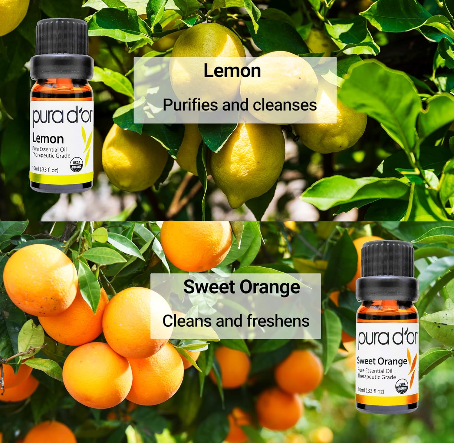 Sense of smell is the oldest and strongest sense in the body. It can help us detect harm from far away, or in most cases, it helps us find peace and balance between our body and mind. PURA D’OR Perfect 10 Essential Oil Set is made of 100% pure and natural USDA certified organic therapeutic grade quality aromatherapy oils. Our fragrance oils offer a variety of uses from aromatherapy to improving overall wellness, massage therapy or even to just initiate a sense of peacefulness and relaxation. Essential oils are extracted from root, seed, flower, leaf, or bark of a tree or plant. Because it is pure and natural, it holds powerful and incredibly beneficial compounds. Any oil from our essential oil set can be diffused or topically applied (only when diluted) to experience its unique properties or even just to feel connected with nature. This set of aromatherapy oils comes with Lavender Essential Oil, Pure Peppermint Oil, Tea Tree Oil, Lemon Oil, Sweet Orange Oil, Rosemary Oil, Lemongrass Oil, Frankincense Essential Oil, Eucalyptus Oil, and Cedarwood Oil. Because essential oils are highly potent, direct application without dilution can cause dryness or irritation on the skin so it is important to always dilute your favorite essential oil with any carrier oils of your choice to make it safe for topical application. PURA D’OR products are free from harsh ingredients and cruelty free. Our products are manufactured in a facility in Southern California where we use renewable energy sources.