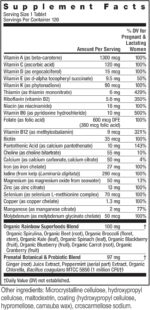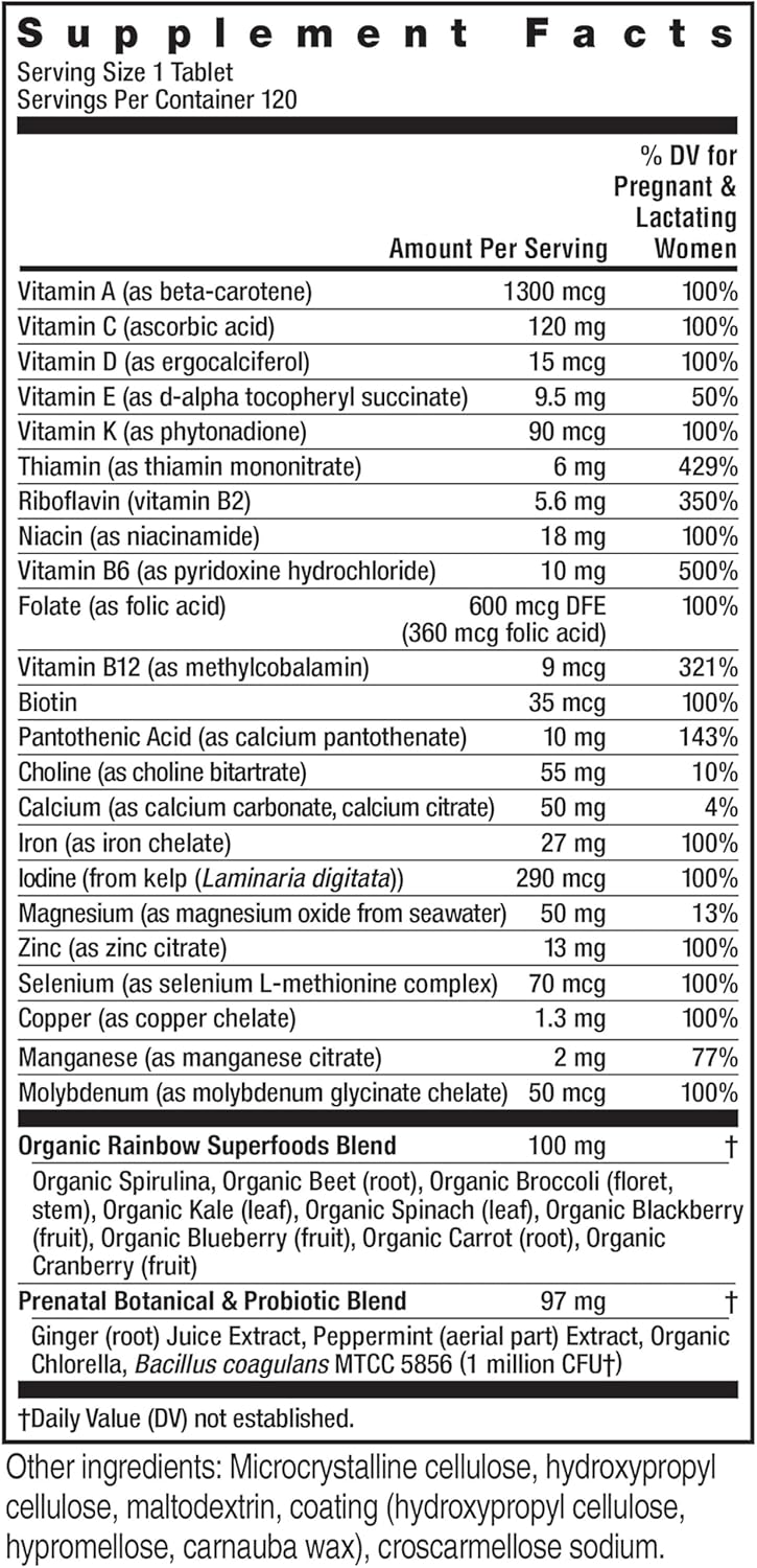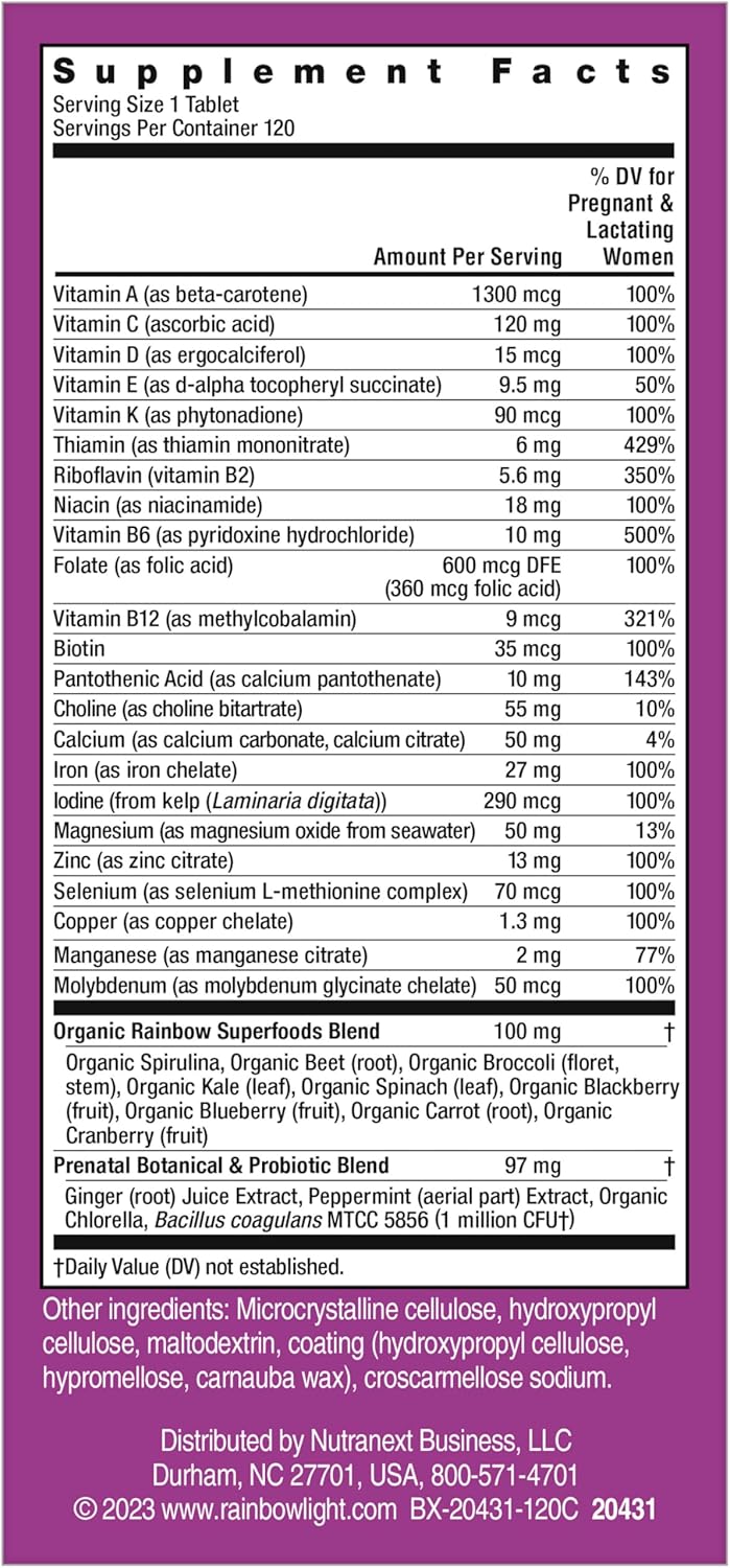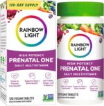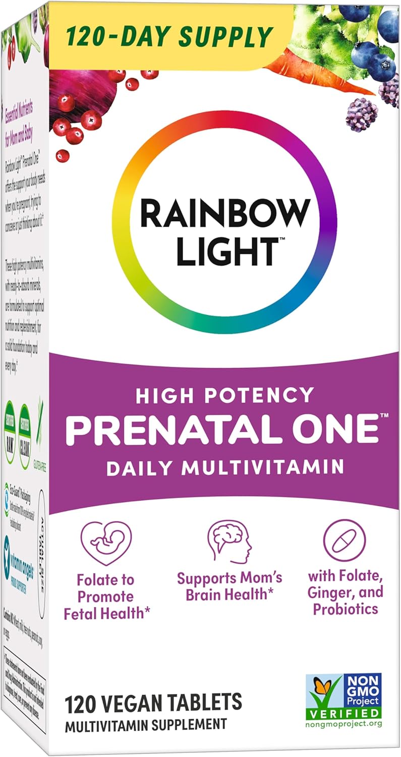 Rainbow Light Prenatal One High-Potency Daily Multivitamin is a high-potency multivitamin for women that supports optimal nutrition and replenishment to give you a solid foundation today and every day (1). Made specifically for mothers, this multivitamin supports moms and babies from conception to nursing (1). Formulated with 100% or more of the daily value of 18 vitamins and ready-to-absorb minerals, this womens multivitamin includes more vitamin C than the previous Rainbow One Prenatal Vitamin to nourish mothers health and babies development. The folate in this women’s multivitamin works alongside iron, ginger and womens probiotics to promote fetal health and moms brain health. Thiamin is also included to support normal heart function in women (1). These prenatal vitamins also promote a babys healthy brain and neural tube development in the early stages of pregnancy (1). Everyone-friendly, this multivitamin is vegan, Non-GMO Project Verified, Certified C.L.E.A.N., Certified R.A.W. and gluten free. (1) These statements have not been evaluated by the Food and Drug Administration. This product is not intended to diagnose, treat, cure, or prevent any disease.