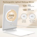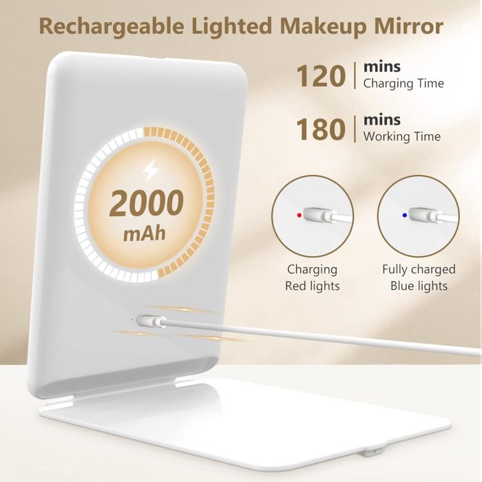 Rechargeable folding travel mirror; the makeup mirror has a built in large capacity 2000mAh battery, which can be available at any time through charged by a laptop, mobile power supply or charger, can be used as a desktop mirror or for daily travel