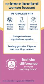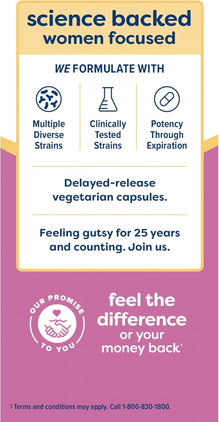 Renew Life Women’s Probiotic Capsules offers 12 probiotic strains to help maintain healthy vaginal bacteria and yeast levels, and support urinary, digestive and immune health (1). Featuring more clinically studied strains than the leading brand (2), these vaginal probiotics contain a blend of 12 different probiotic strains including L. rhamnosus GG, the No. 1 most studied strain (3). With 25 billion cultures, these Renew Life probiotic capsules make it easy for you to support your vaginal, urinary, digestive and immune health. Each strain is clinically tested and formulated by microbiologists and researchers to offer science-backed health benefits you can enjoy every day. Potency, quality and purity are guaranteed through the expiration date. These probiotic pills incorporate scientifically tested strains specifically formulated to support feminine health and maintain a healthy pH balance. This daily probiotic supplement offers a Non-GMO Project Verified formula that is gluten-free, dairy-free and soy-free. Renew Life puts health and wellness first with supplements that are backed by over 25 years of clinical trials. (1) These statements have not been evaluated by the Food and Drug Administration. This product is not intended to diagnose, treat, cure or prevent any disease. (2) Based on IRI unit sales data, January 2021. (3) L. rhamnosus GG strain, PubMed Clinical Trials, August 2019.