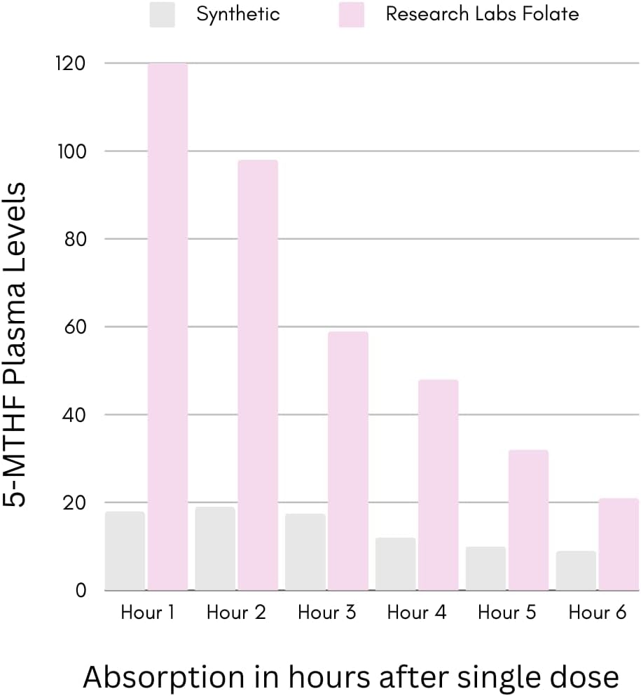6X More Bioavailable Folic Acid – MTHF 5-methyltetrahydrofolate or methylated Folate used instead of the inferior synthetic version more commonly used. Studies show methylated folate is up to 6 times more bioavailable or absorbed more.