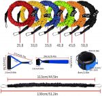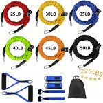 adjustable resistance bands: with 51.2 inch long colored exercise bands: red-25LBS; yellow-30LBS; green-40LBS; blue-35LBS; orange-45LBS; black-50LBS, all bands can be stacked together with a maximum resistance value of 225LB in a set of 6 bands