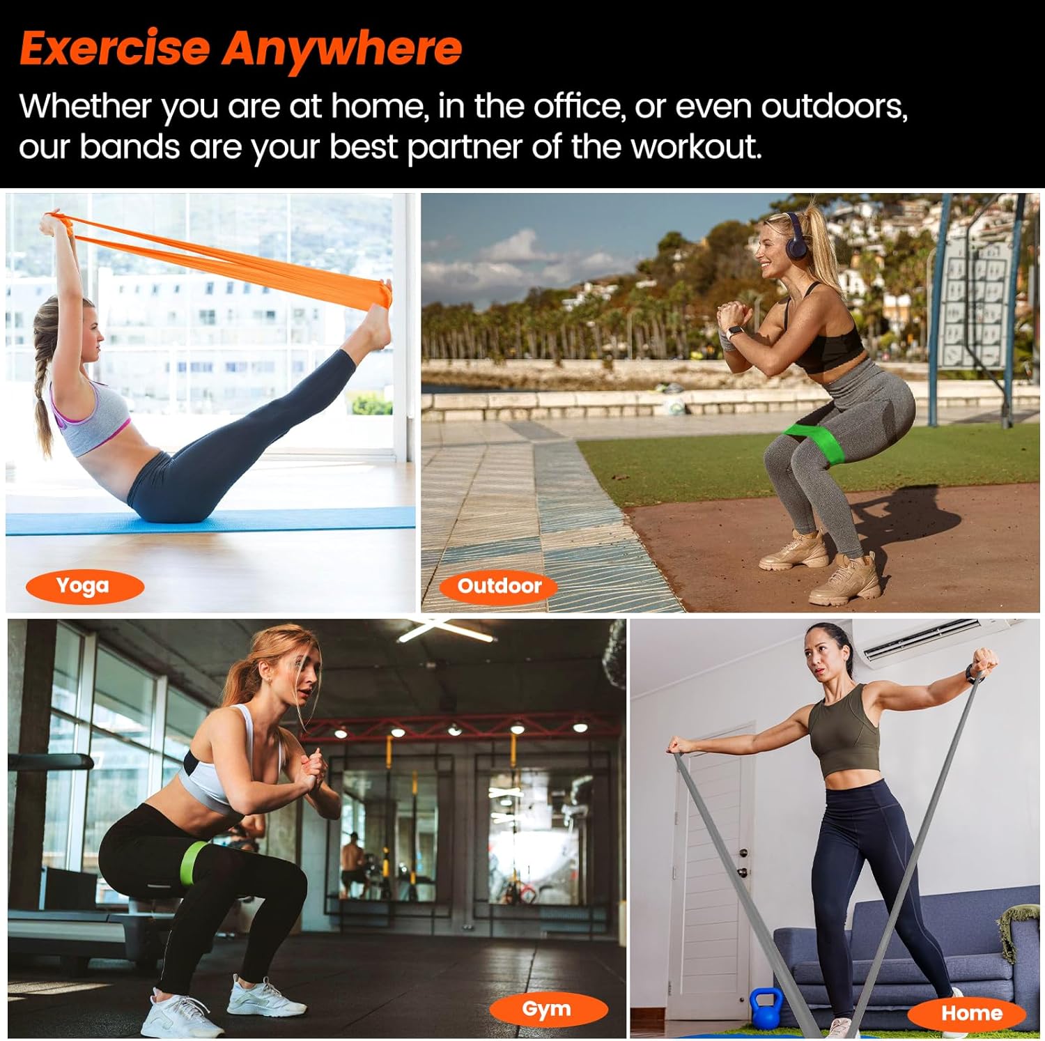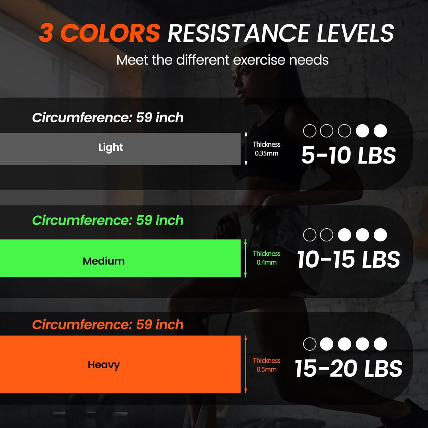 Different Resistance Levels: Our workout resistance bands come in three different levels of resistance for your convenience: Grey band (Light, 0.35 mm), Green band (Medium, 0.4 mm), and Orange band (Heavy, 0.5 mm). Say goodbye to concerns about bands being too difficult; effortlessly switch between the three levels based on your preference at any time