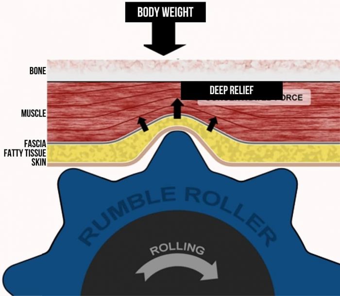 Deep massage of the RumbleRoller not only relieves sore muscles, it digs into connective tissue and fascia to help circulate blood and oxygen for pain relief and faster muscle recovery