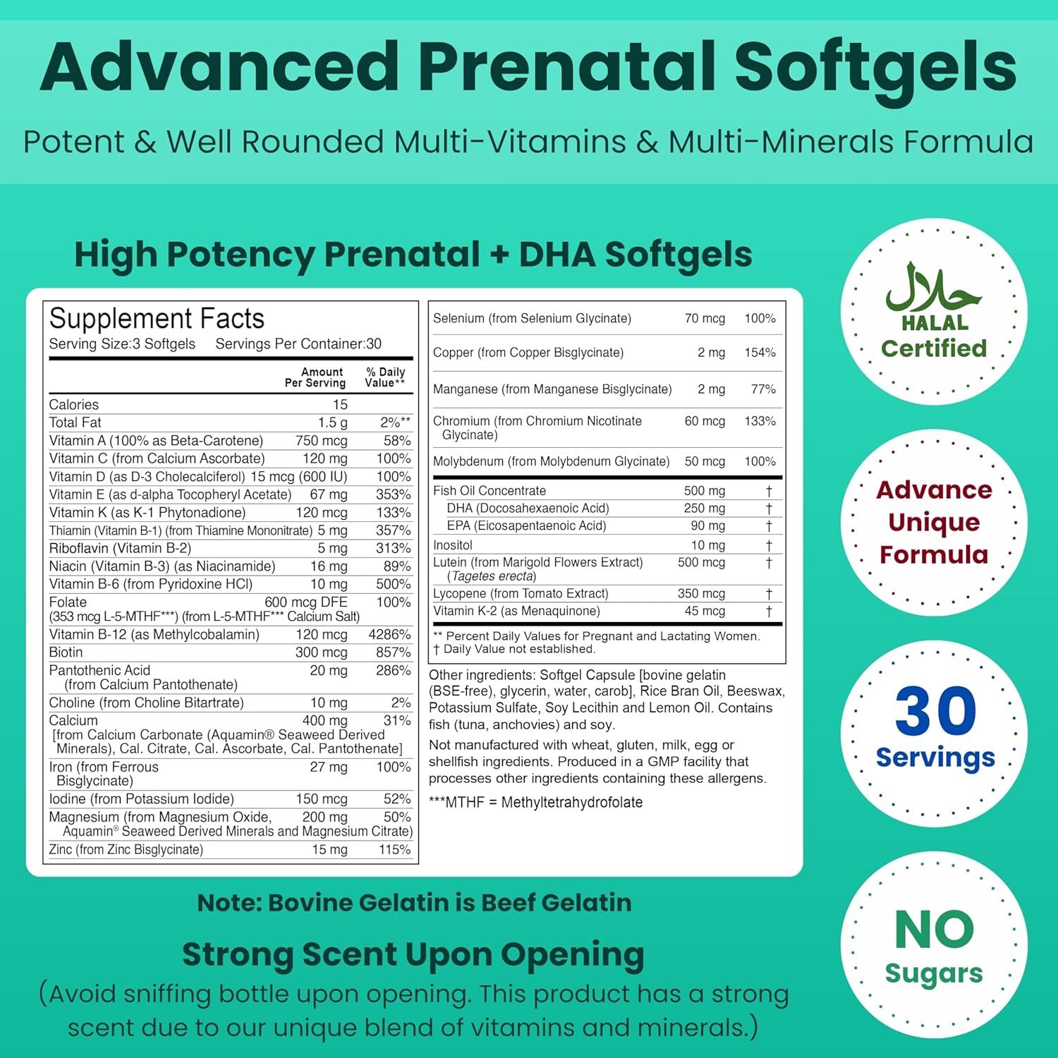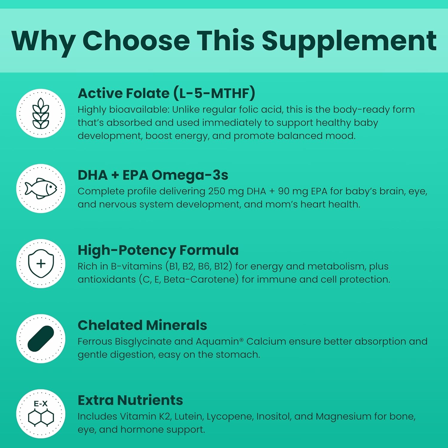HIGH POTENCY FOR ADEQUATE DEVELOPMENT: High In Potency To Support All Development and Defense Mechanisms: DHA 250mg, EPA 90mg, LUTEIN 500mg, FOLIC ACID 800mg, IRON 27mg (Free From Bisglycinate), Iodine 150mg, Vitamin A 5000IU, Vitamin C 120mg, and Calcium 400mg. Other Vitamins and Minerals: Vitamin A, D3, K, B1, B2, B3, B5, B6, B12, Biotin, Magnesium, Zinc, Selenium, and More.