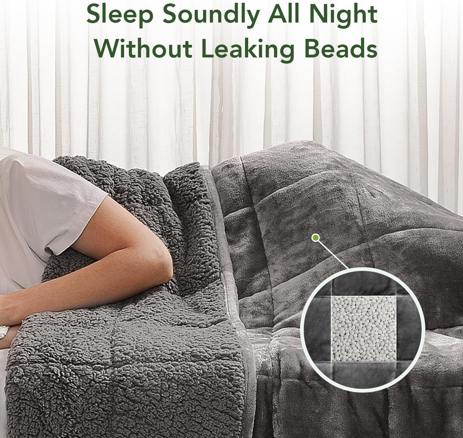 Industry-Leading Craftsmanship: Filled with nontoxic and environmental ceramic beads in polyester layers, upgraded weighted blanket adopts the top-notch 7-layer beads-locking design to achieve max. comfort with proper pressure. The exquisite sewing method enables the beads to lock securely and evenly in each compartment in case of any leakage or sound noise when you turn your body.