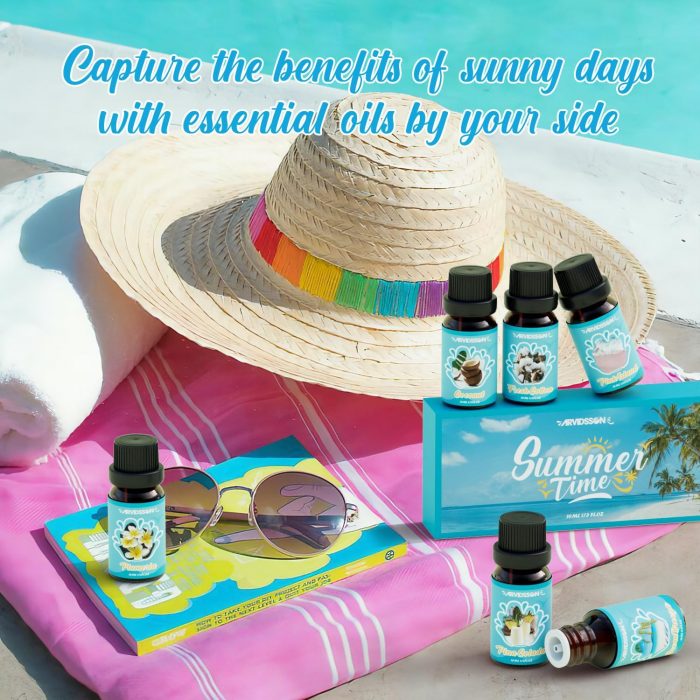 Summer Vibes Oils Set: ARVIDSSON summer collection features 6 x 10ml premium essential oils, including Ocean Breeze, Pina Colada, Fresh Cotton, Pink Island, Plumeria, Coconut. Treat your senses with our summer essential oil and let your home be enveloped in a continual flow.