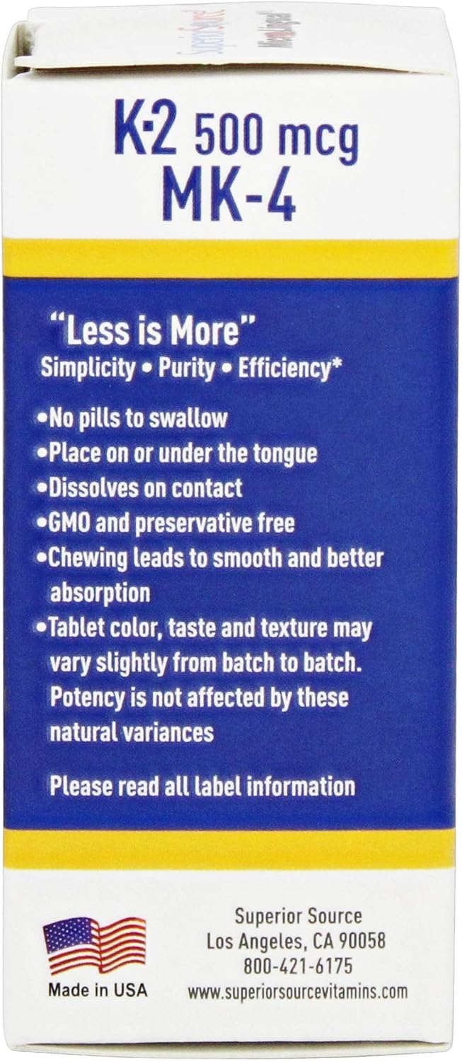 Enjoy your wellness journey with Superior Source Vitamin K2 500 mcg MK-4. Our health supplement is expertly formulated to support bone strength, aiding the direction of calcium to where it?s needed most. By incorporating MK-4, the primary form of vitamin K2 in the body, this vitamin supplement plays a crucial role in supporting healthy bones and cardiovascular function. Superior Source?s vitamin K2 supplement works in harmony with your body?s natural processes, supporting the immune system and aiding overall health. Whether you’re looking to support your bone strength or aid your health regimen, our formula provides essential nutrients to help support your health. Featuring quick-dissolving sublingual tablets, our vitamin K2 supplement aids quick absorption for maximum health support. Trust Superior Source for high-quality vitamin supplements that support your health goals with every dose. Superior Source MicroLingual vitamins are bariatric- and senior-friendly. Operating from a 100,000-square-foot manufacturing facility, Continental Vitamin Company was founded by Ron Beckenfeld in 1969. With a state-of-the-art GMP-certified facility, CVC’s exceptional Superior Source product line has earned the trust of the natural product community with a growing list of over 100 products, including MicroLingual tablets. The company has been a member of the Natural Products Association since 1997.