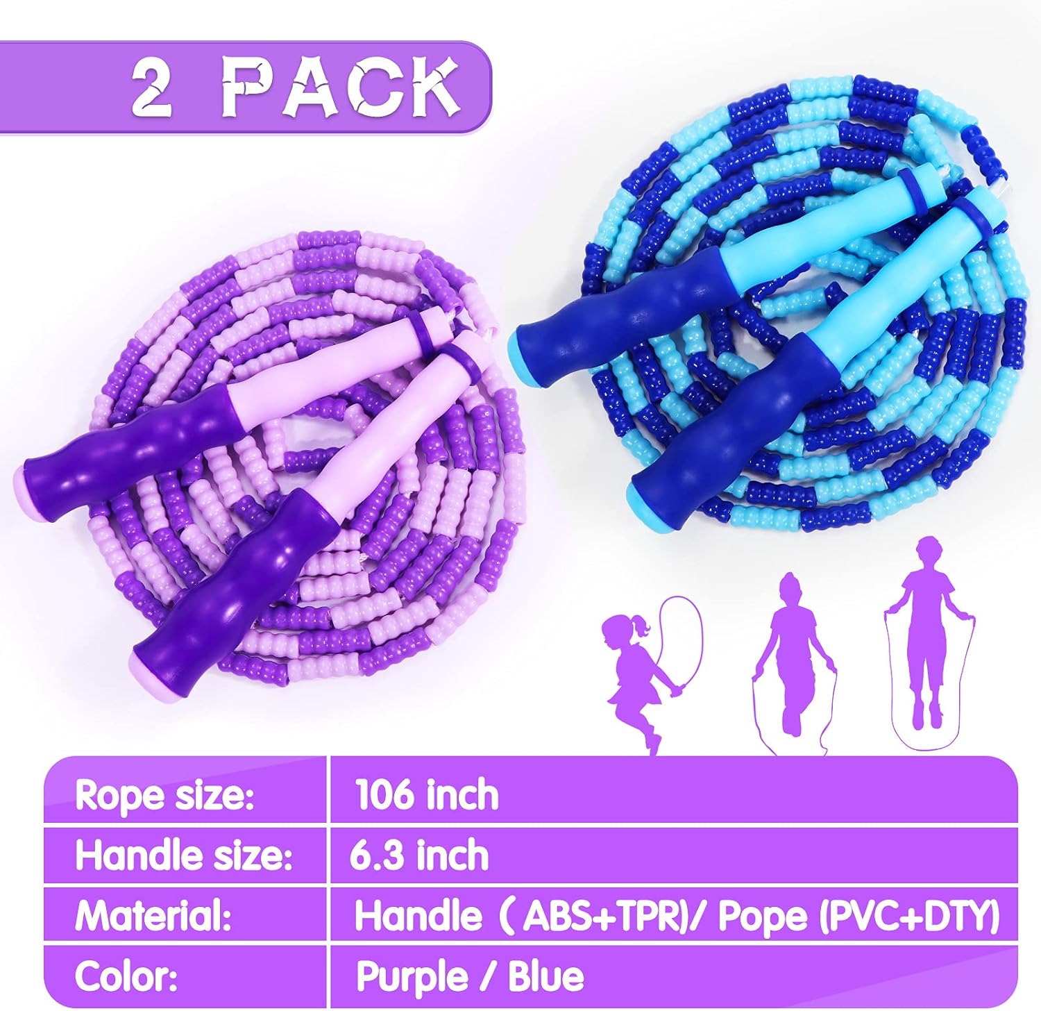 2 Pack Premium Kids Jumping Rope 106 Inch:The kids jump rope is 106 inch long. Features 1 inch(2.5cm) plastic segmented beads over a solid, long-lasting braided nylon cord, suitable for kids,children and students.