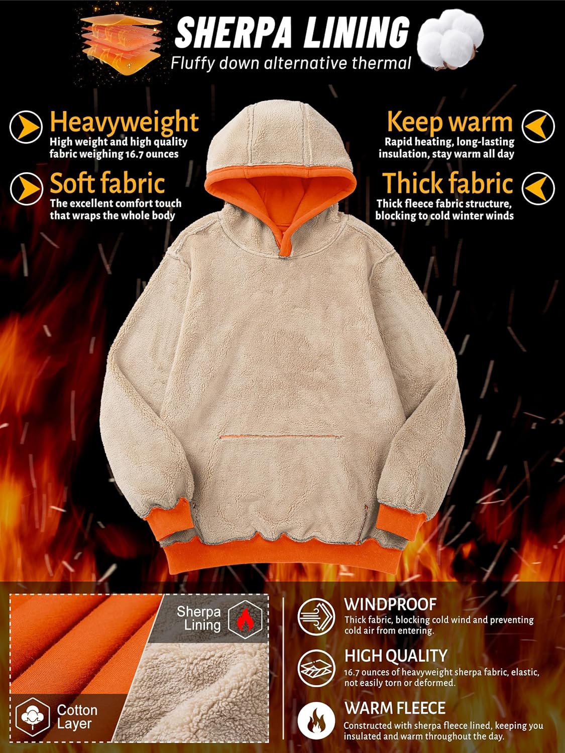 The men’s winter hoodie is lined with heavyweight Sherpa fleece, it helps keep out the cold and chill of winter, keeping you warm without being bulky.