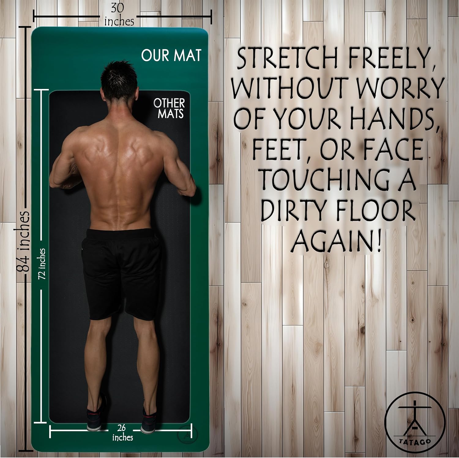 Long Yoga Mat, Extra Thick Wide and tough enough to be a yoga mat for men. We designed this Bmat Yoga Mat & Fitness mat for Yoga & Pilate students like myself who need some extra room to stretch out. At 7ft long & 2.4ft wide you won’t have to worry about your hands, feet, or face on the floor again while perfecting your practice. Investing in a Tatago fitness mat means you care for the earth by not allowing the dumping of another cheap mat into a landfill after only using for a short time. This is not your standard cheap and slippery TPE yoga matt. We chose to make the Tatago Grand Mat’ster with high grade natural tree rubber & PU leather, with a high density 5mm padding for joint cushioning and support. This mat is designed for comfort, built for size & made to last. Pair this yoga mat with the Tatago Grand Towel’ster large yoga towel. For a women or mens workout routine with a need for superior quality & craftsmanship compared to a lightweight standard-cheap exercise mat. Tatago. We actually made our yoga mat non slip. Anyone else? Natural rubber bottom gives you cushioning and secures your floor mat for all your practices PU leather top layer absorbs moisture & gives you a non slip grip