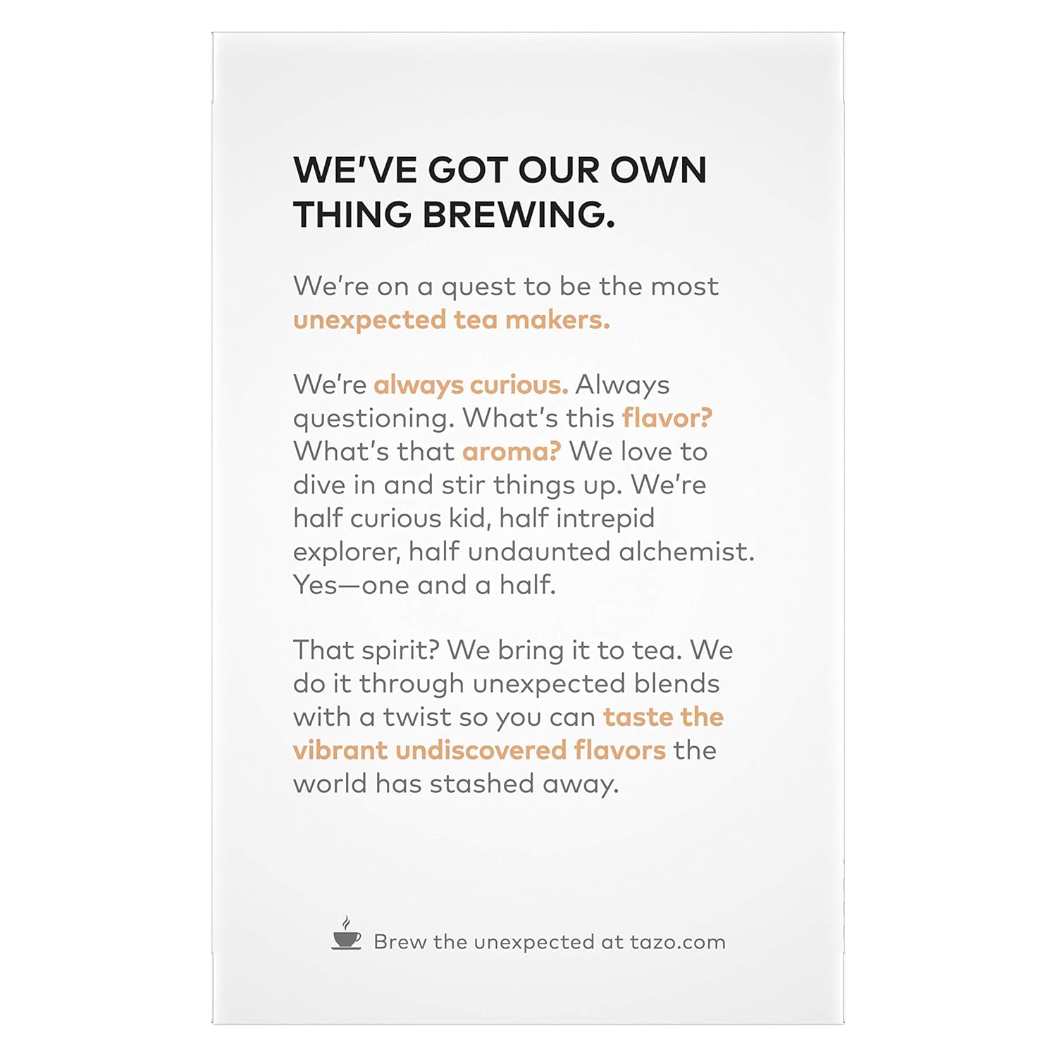 TRUSTED COMPANY: TAZO Teas are produced without genetic engineering, meeting the Non-GMO Project Standard. Ingredients are expertly sourced giving a taste for you to savor
