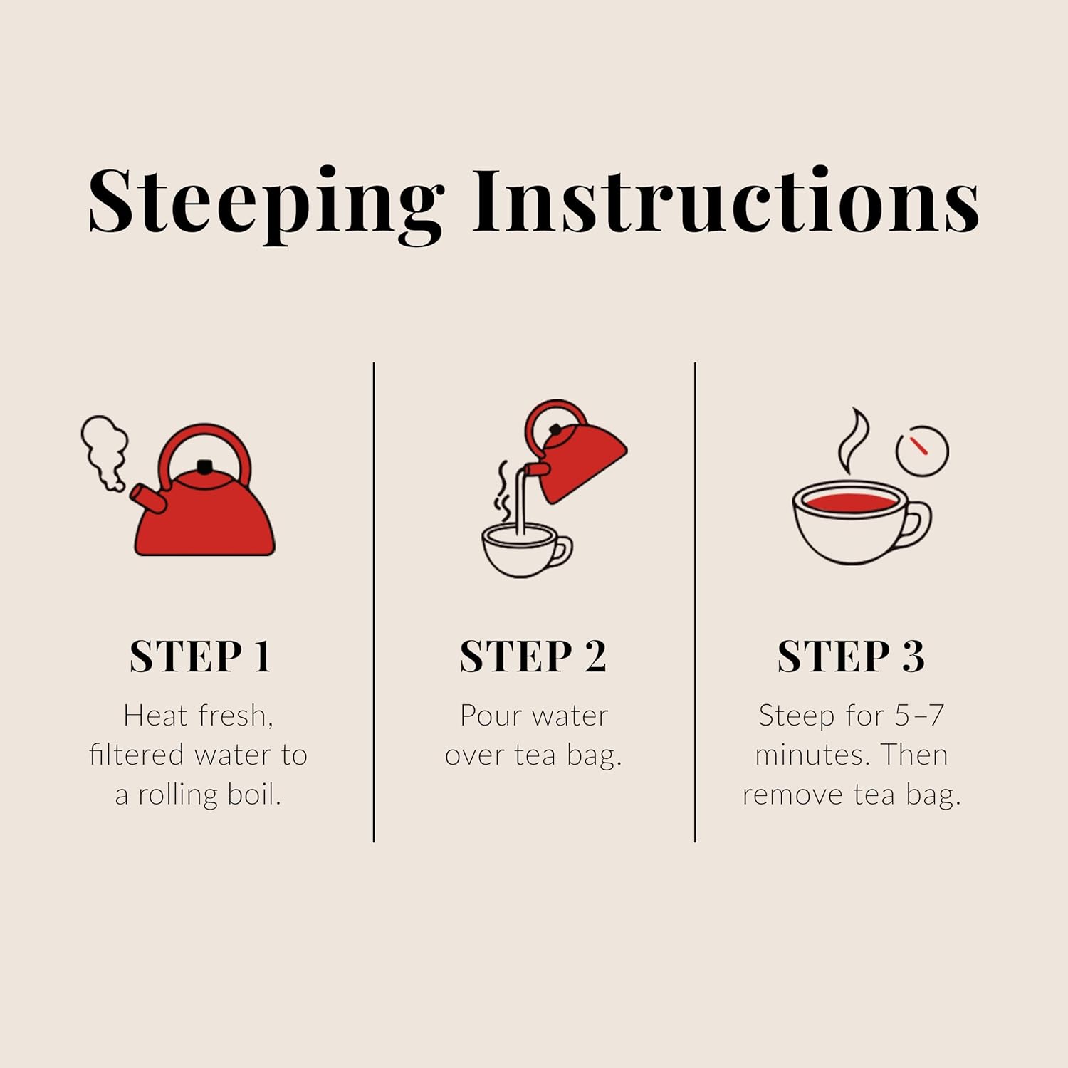 STEEPING INSTRUCTIONS: Simply heat fresh, filtered water to a rolling boil. Then pour 6 oz of water over tea and steep for 5-7 minutes. After steeping, add the used tea bags to compost or soil — they make gardens happy.