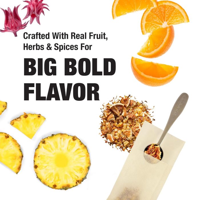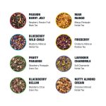 Maui Mango (pineapple (pineapple, cane sugar), orange slices, mango (mango, cane sugar), natural flavors, safflowers, hibiscus, strawberries, marigolds), Blueberry Wild Child (apple, hibiscus, elderberries, rose hip, natural flavors, pomegranate bits, blueberries, cornflowers) ,Nutty Almond Cream (apple, planed almonds, sliced almonds, cinnamon, beetroot. tree nuts), Lavender Chamomile (chamomile, lemongrass, blue mallow blossoms, lavender),Fruity Paradise (green tea, pineapple, mango, strawberries), and Passion Berry Jolt (herbal tea, ginger tea), Blackberry Bellini (pineapple (pineapple, cane sugar), greentea sencha, elderberries, lemon peel, raspberry grit freeze dried , blackberries, natural flavors).